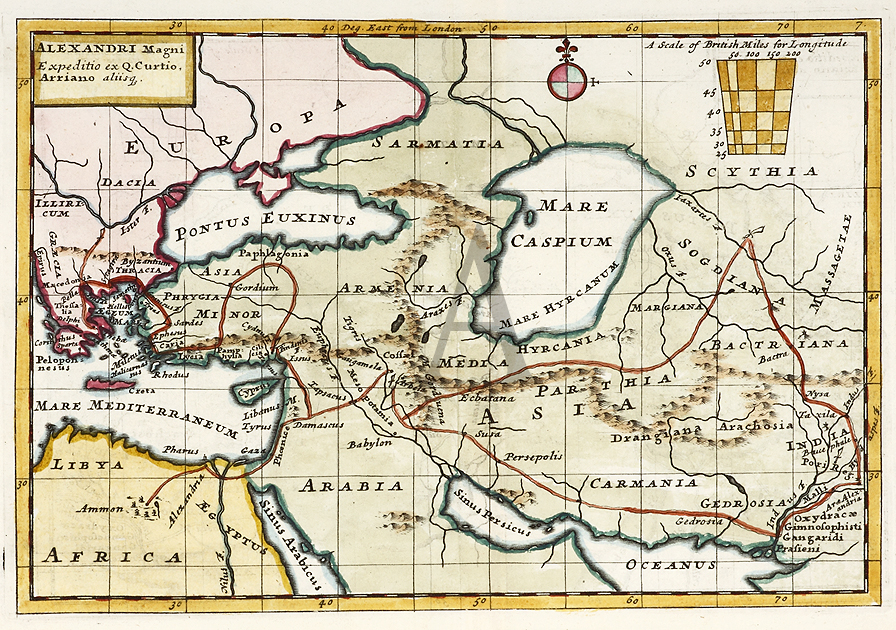 Map of Alexander’s tracks from "Thirty two new and accurate maps of the geography of the ancients". Herman Moll was a Dutch �migr� who came to London about 1680 and worked there as an engraver, later setting up his own business and becoming, after the turn of the century, the foremost map publisher in England. His work enjoyed a high reputation and much of it was copied by other publishers.
