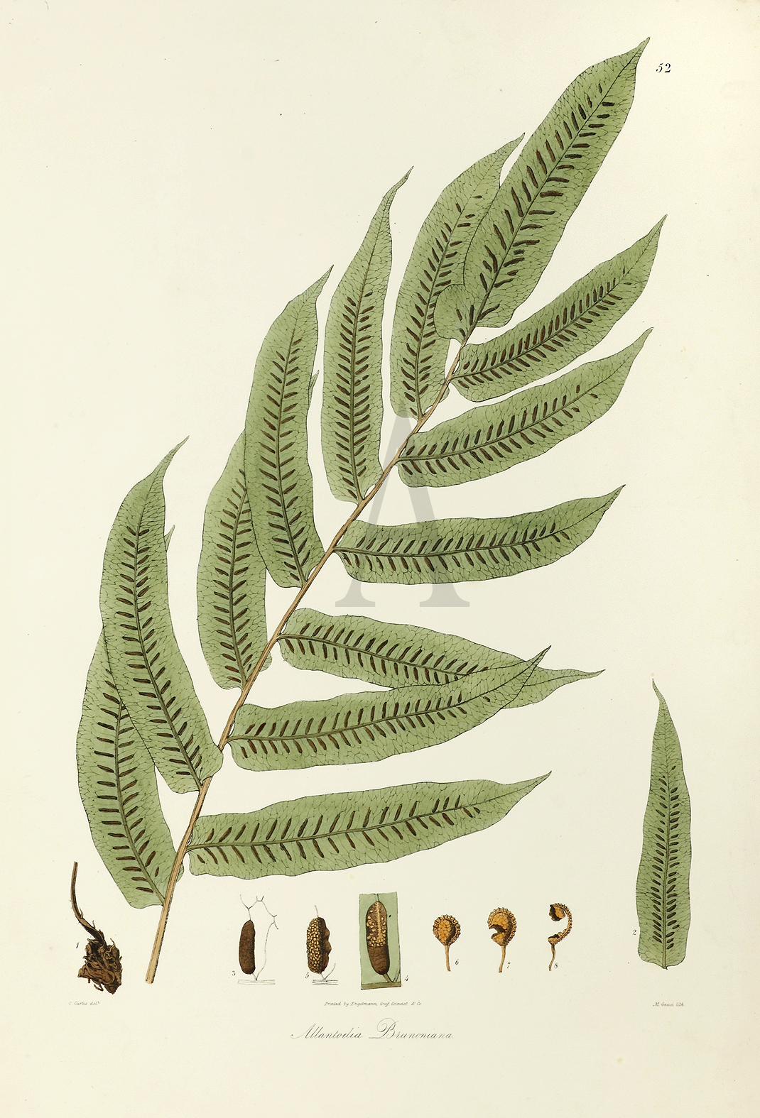 Beautiful large lithograph of Diplaziopsis javanica from Wallich’s series, Plantae Asiaticae Rariores was issued in 1830–1832. Wallich used for the first time Indian artists for the original paintings. These talented artists were, Vishnupersaud and Gorachand. Vishnupersaud’s skill was legendary and Wilfrid Blunt included one of his watercolours in his book The Art of Botanical Illustration as displaying great craftsmanship.