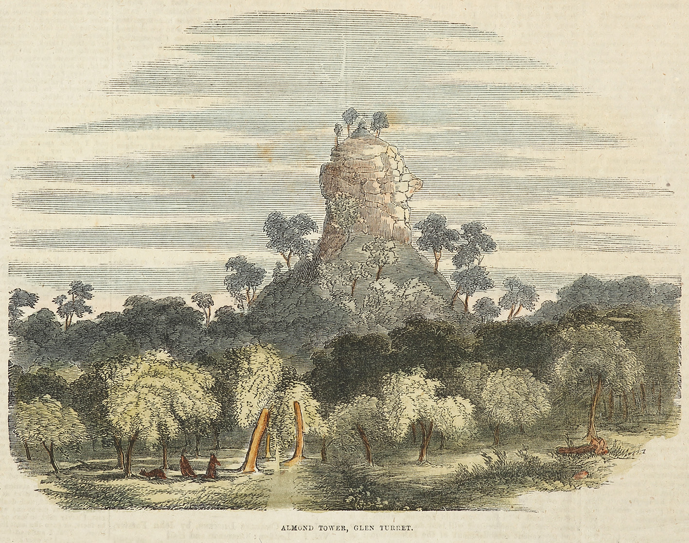 Rare, c.19th hand coloured engraved view of Almond Tower, Glen Turret, which was first recorded by Thomas Mitchell on his fourth expedition.