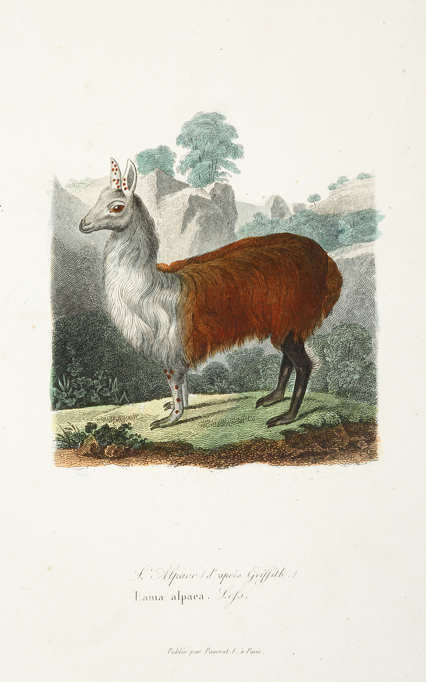 Early engraving of an Alpaca from Buffon, Compléments de Buffon.