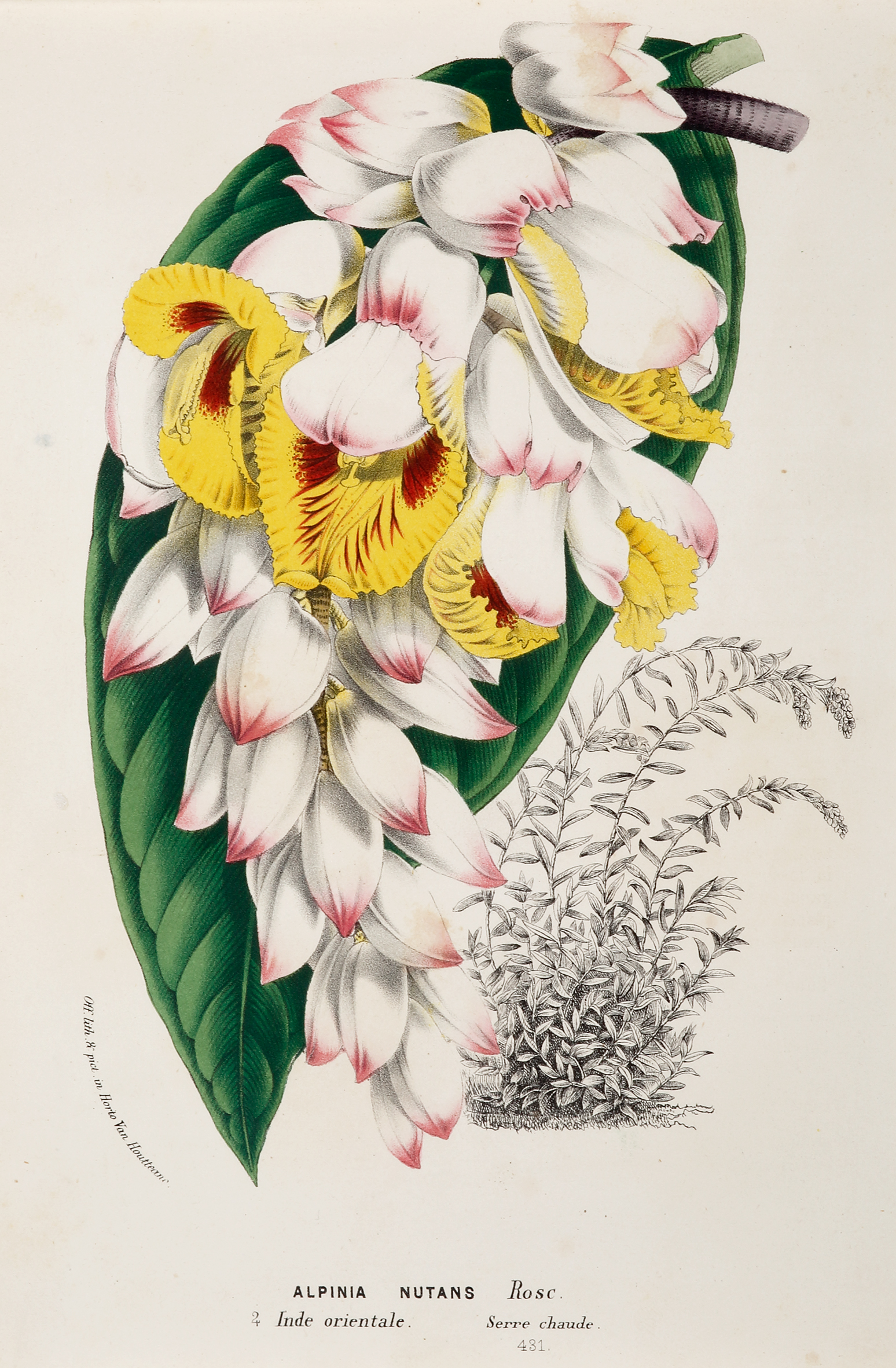 Stunning exotic botanical from Louis van Houtte’s, Flore des Serres et des Jardins de l’Europe (Flowers of the Greenhouses and Gardens of Europe). Common Name: Shellflower or Dwarf Cardammon Distribution: Southeast Asia