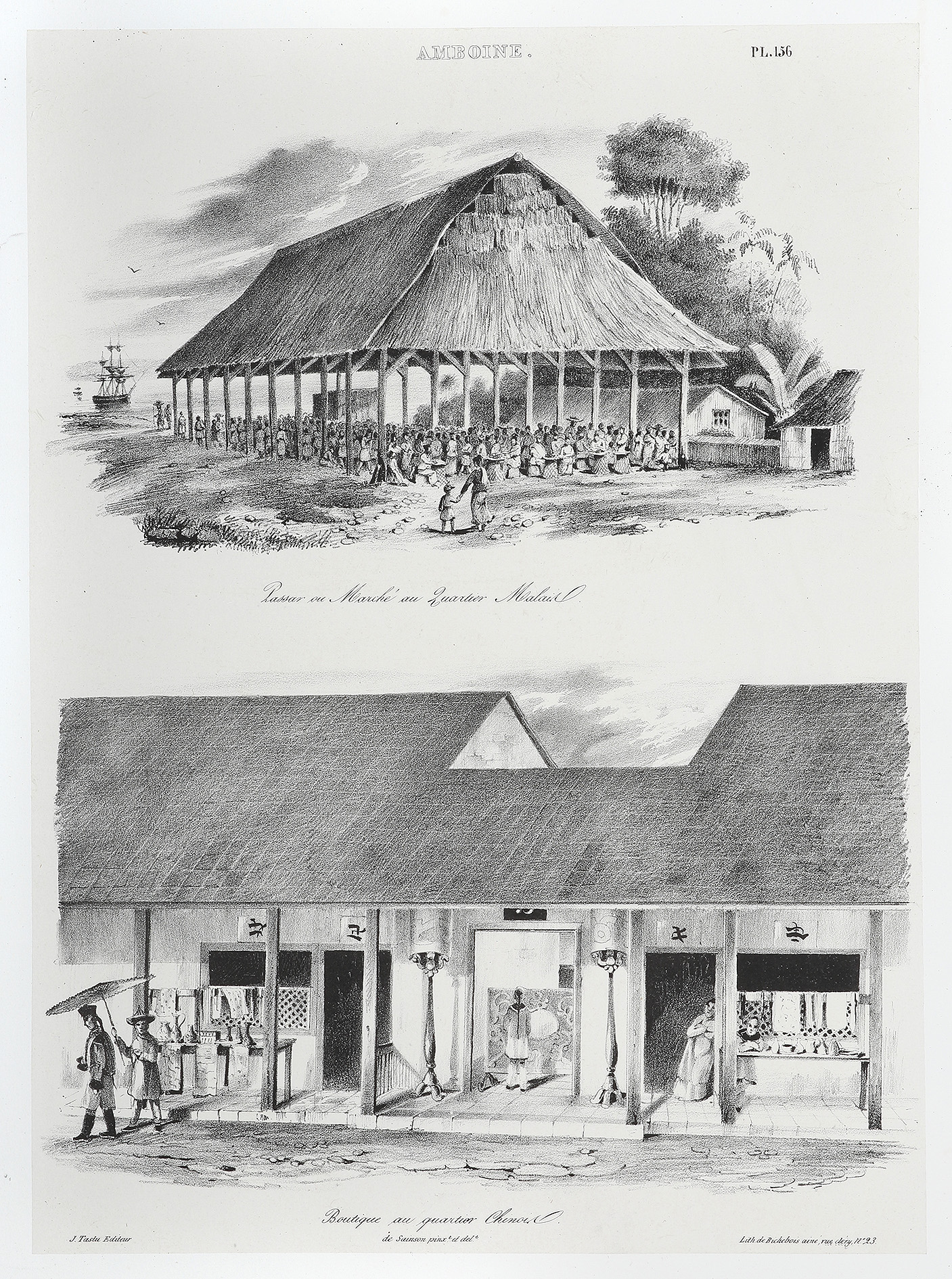 First edition of this superb Chine-collé lithograph on India paper of the Malay market and Chinese shops in Ambon Island, Indonesia by Louis de Sainson artist aboard the famous Dumont D’Urville voyage of scientific discovery and exploration.