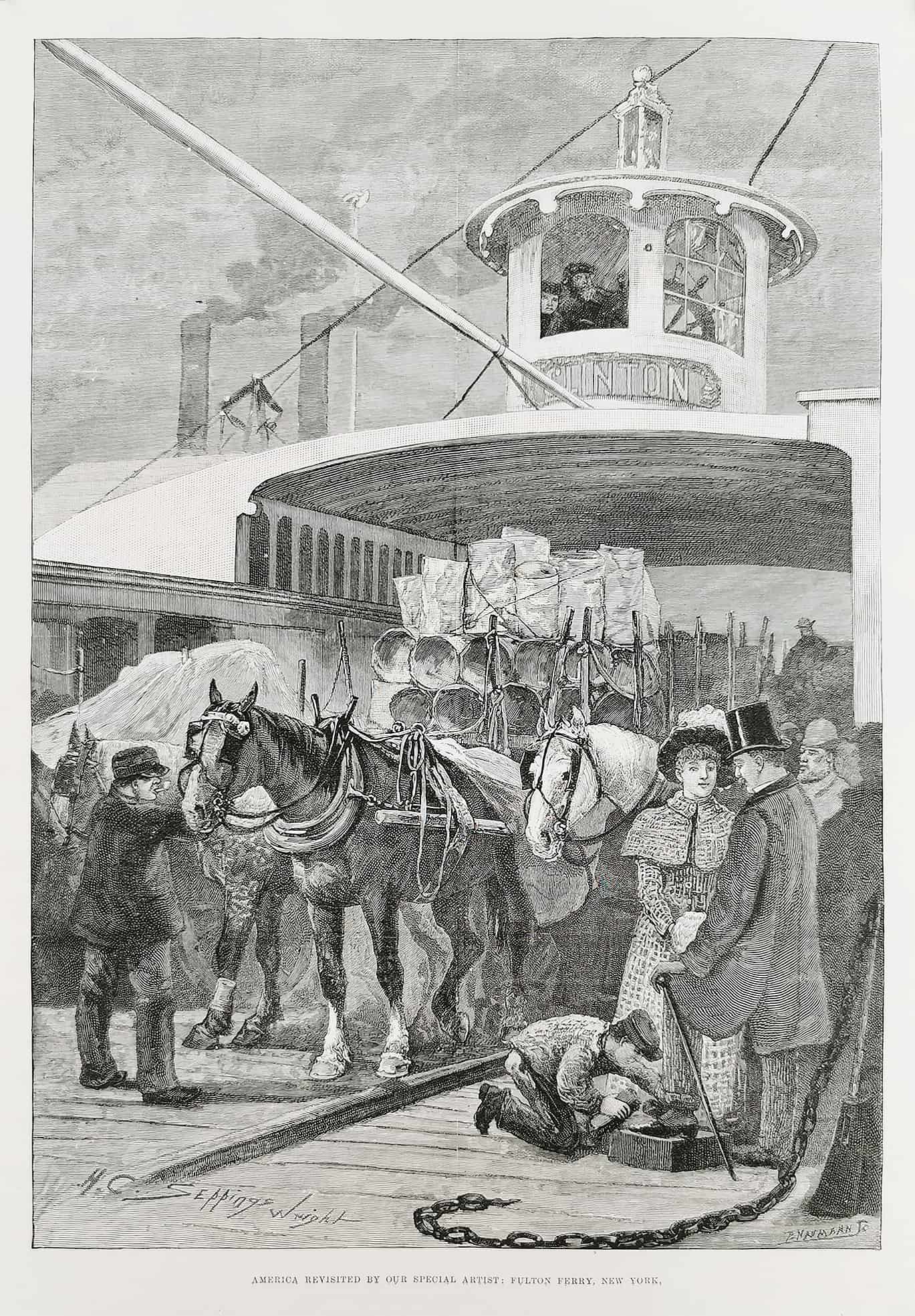 Engraving of the Fulton Ferry, in New York. From the original edition of The Illustrated London News.