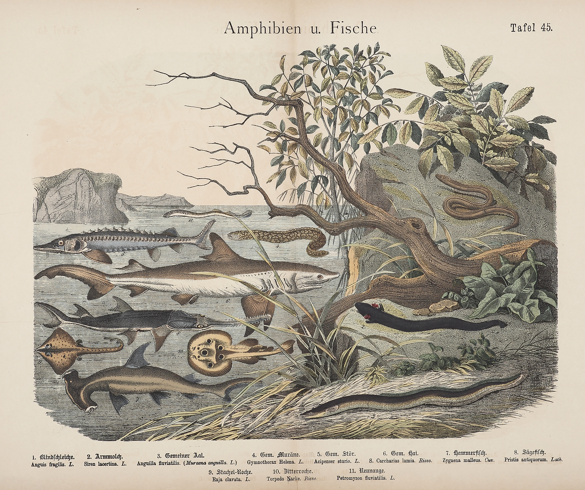 Scarce, c.19th hand coloured lithograph, of sharks, rays and eels. From the first edition of this series, identified by word Tafel before the plate number. In later editions this is removed. From: Hanselmann, E. Naturgeschichte des Tierreichs. Stuttgart 1868 (1st edition)
