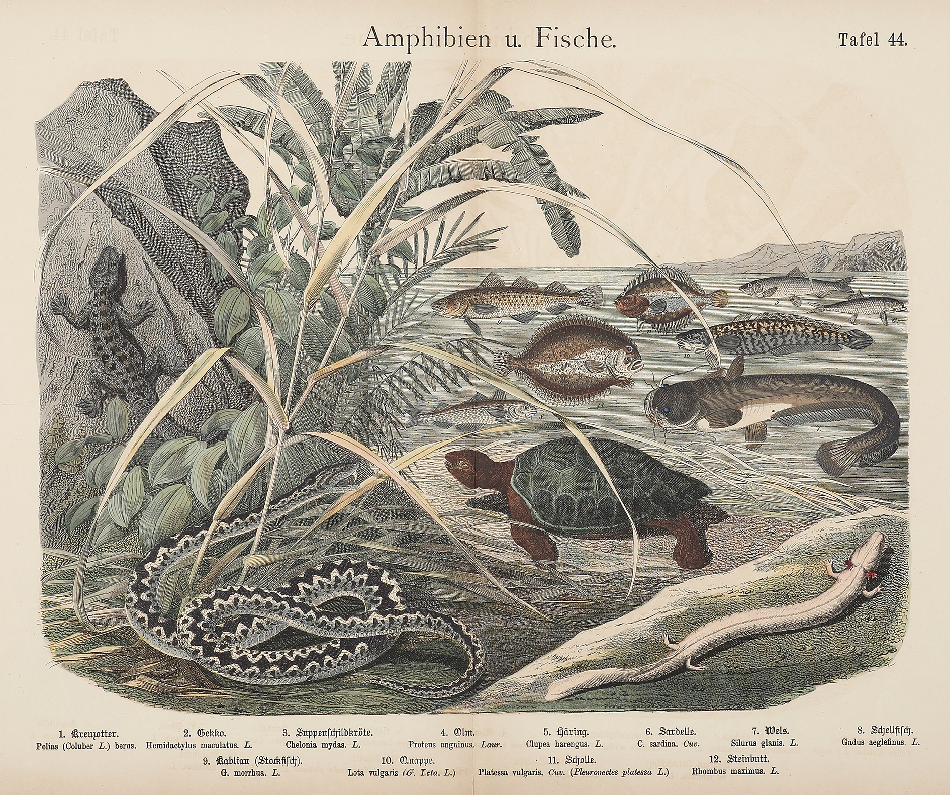 Scarce, c.19th hand coloured lithograph, of turtles, snakes and lizards. From the first edition of this series, identified by word Tafel before the plate number. In later editions this is removed. From: Hanselmann, E. Naturgeschichte des Tierreichs. Stuttgart 1868 (1st edition)