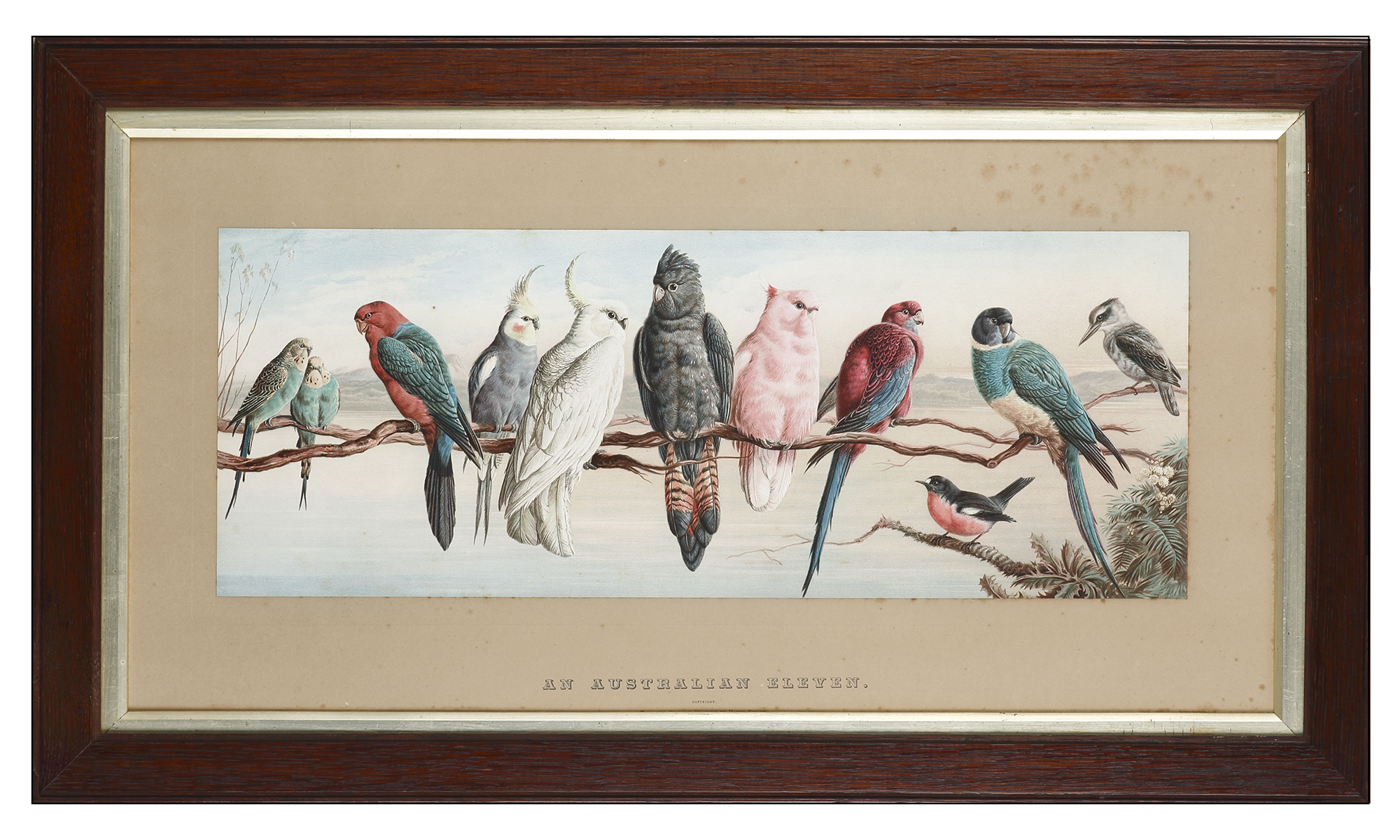 The Australian birds depicted from left to right are; Budgerigar, King Parrot, Cockatiel, Sulphur-crested Cockatoo, Red-tailed Black cockatoo, Major Mitchell Cockatoo, Crimson Rosella, Robin, Port Lincoln Parrot and the Kookaburra.