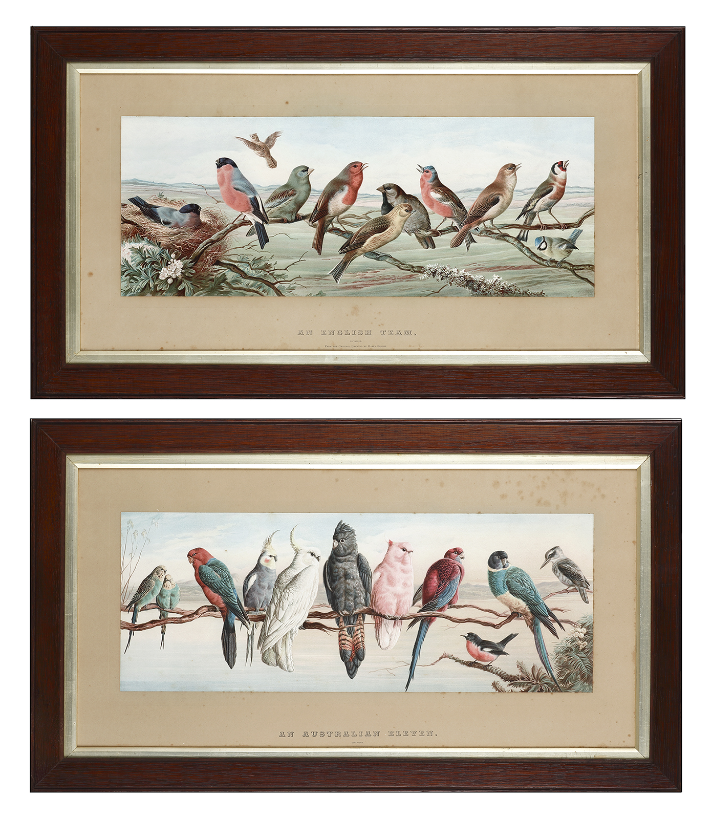 Pair of famous cricketing lithographs depicting Australian and English birds in their original period oak frames and printed card mounts.