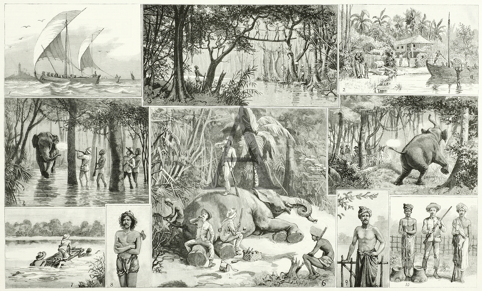 C19th engraved view of an elephant hunt in Ceylon.