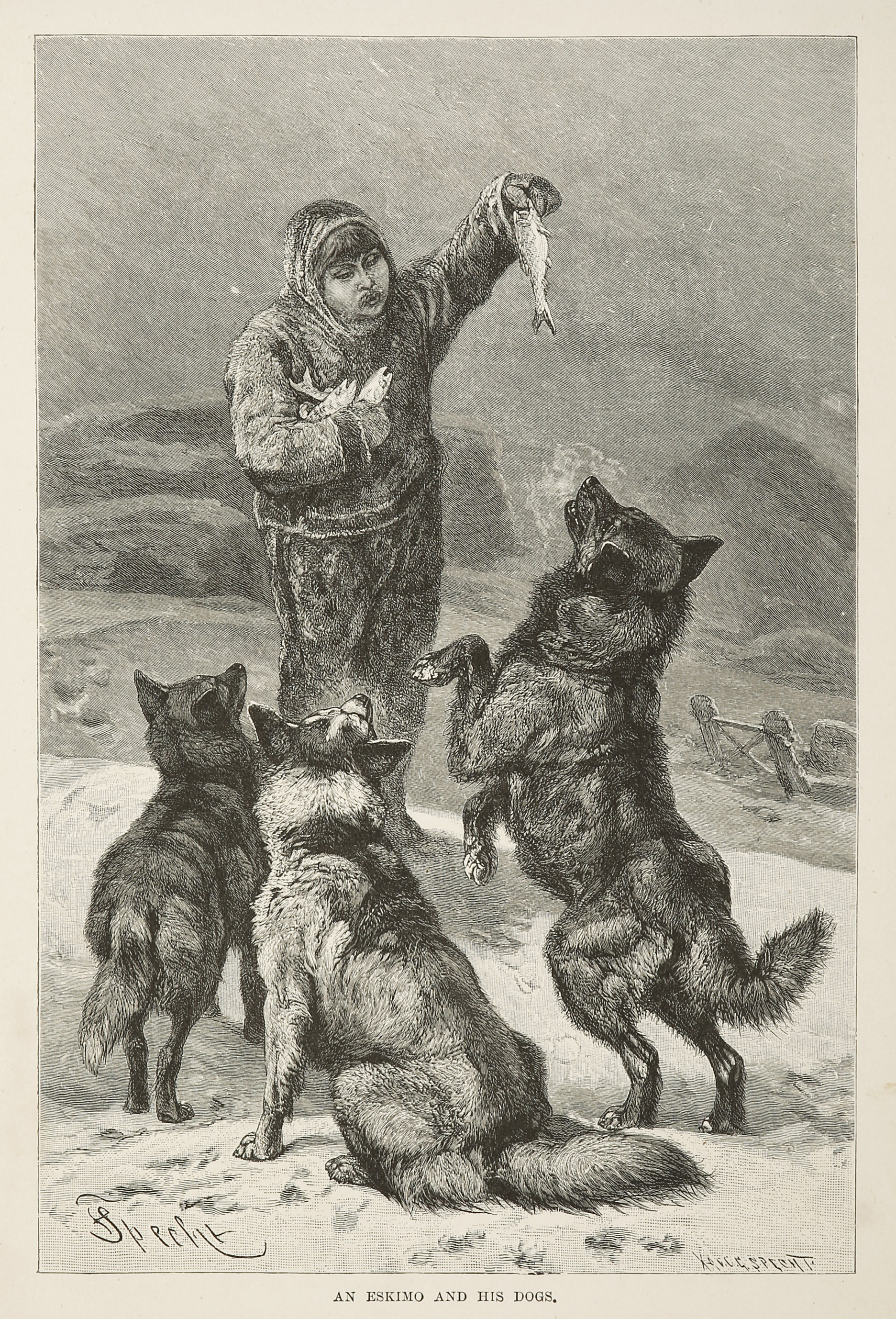 C19th engraving of an eskimo and huskies.