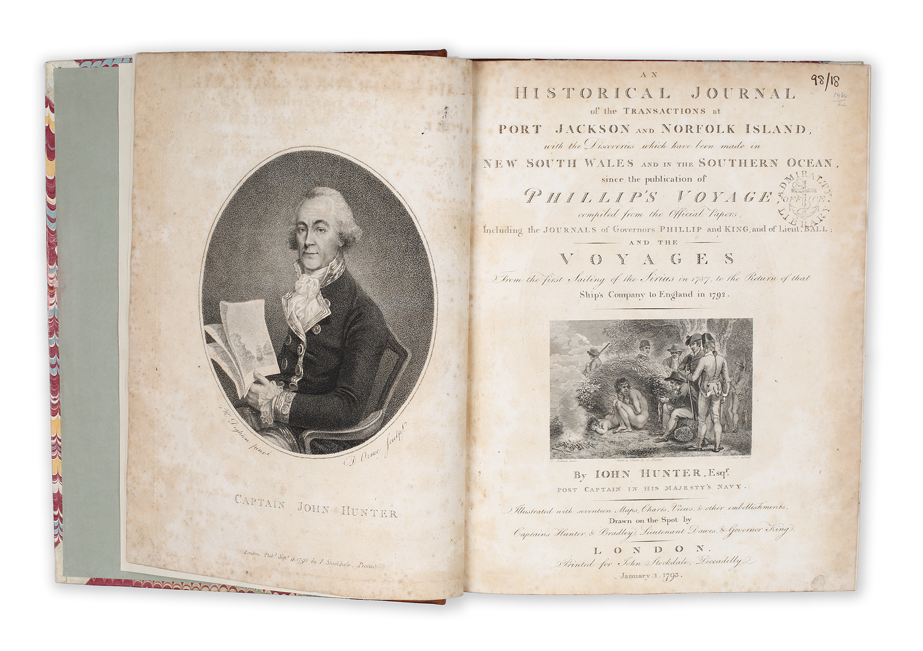 The maps, charts, views and other embellishments, drawn on the spot by Captains Hunter,and Bradley, Lieutenant Dawes, and Governor King. London : John Stockdale, 1793. Engraved frontispiece, pp (ii) (engraved title page and blank verso), Admiralty Library Office stamp to title page, [vi] (list of subscribers); [ii] (list of plates and blank verso), [viii] contents; 583, with 5 maps and charts (2 large folding) and 10 engraved plates; frontispiece and title and both folding maps with scattered foxing, the remaining plates and pages with occasional light foxing, a good copy with wide margins.