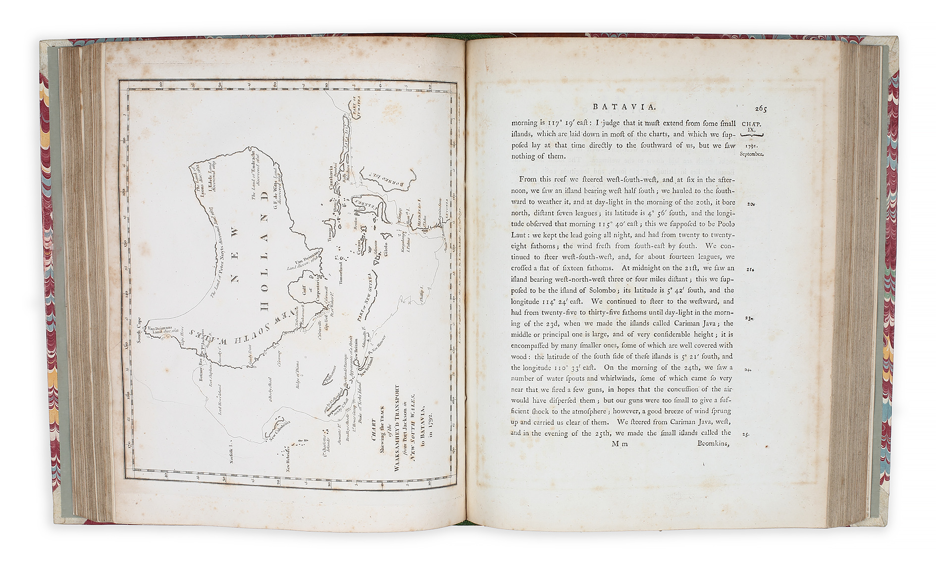 Quarto, portrait of Captain John Hunter and engraved vignette on title page, 5 pp. list of subscribers, 583pp, 17 pl. and maps. Quarto, modern quarter calf over marbled papered boards, spine in compartments with gilt ornament and contrasting leather title labels lettered in gilt. The seventeen engraved plates and maps, include, portraits, large folding maps; 1. Territory of New South Wales showing the extent of settlement 2. Chart of the coast between Botany Bay, Port Jackson, and Broken-Bay 3. Australia (upside down), Prints; View of the Settlement in 1788 (the first engraving of Sydney). Without the usual cropping of the first line of title the title and removal of the date on the title page.