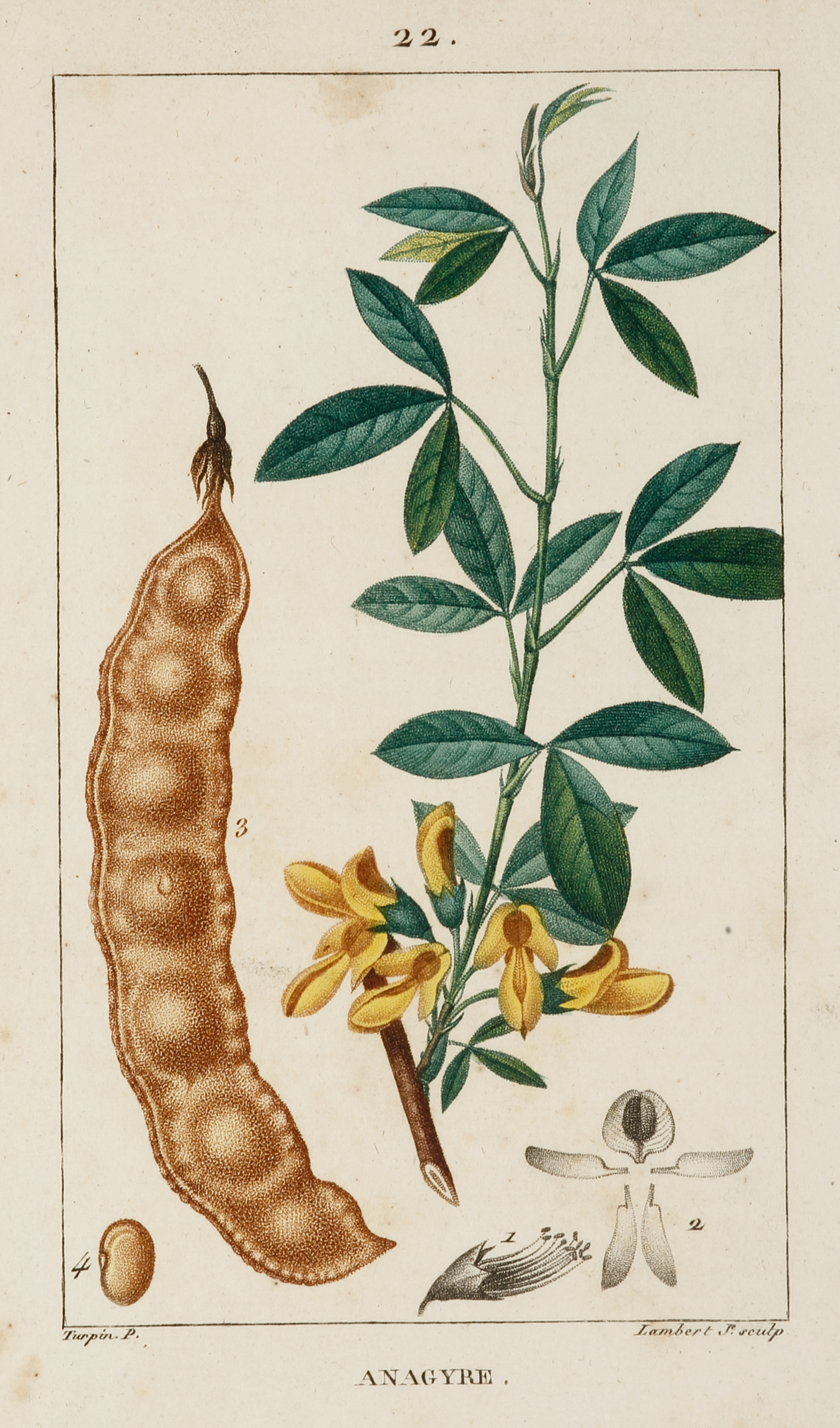 Very fine stipple engraving of the Stinking Bean-Trefoil plant from one of the most important French medicinal herbals of the 19th century. Rare. From Chaumeton, Flore Medicale References, Nissen BBI 349; Plesch 131; Pritzel 1679.