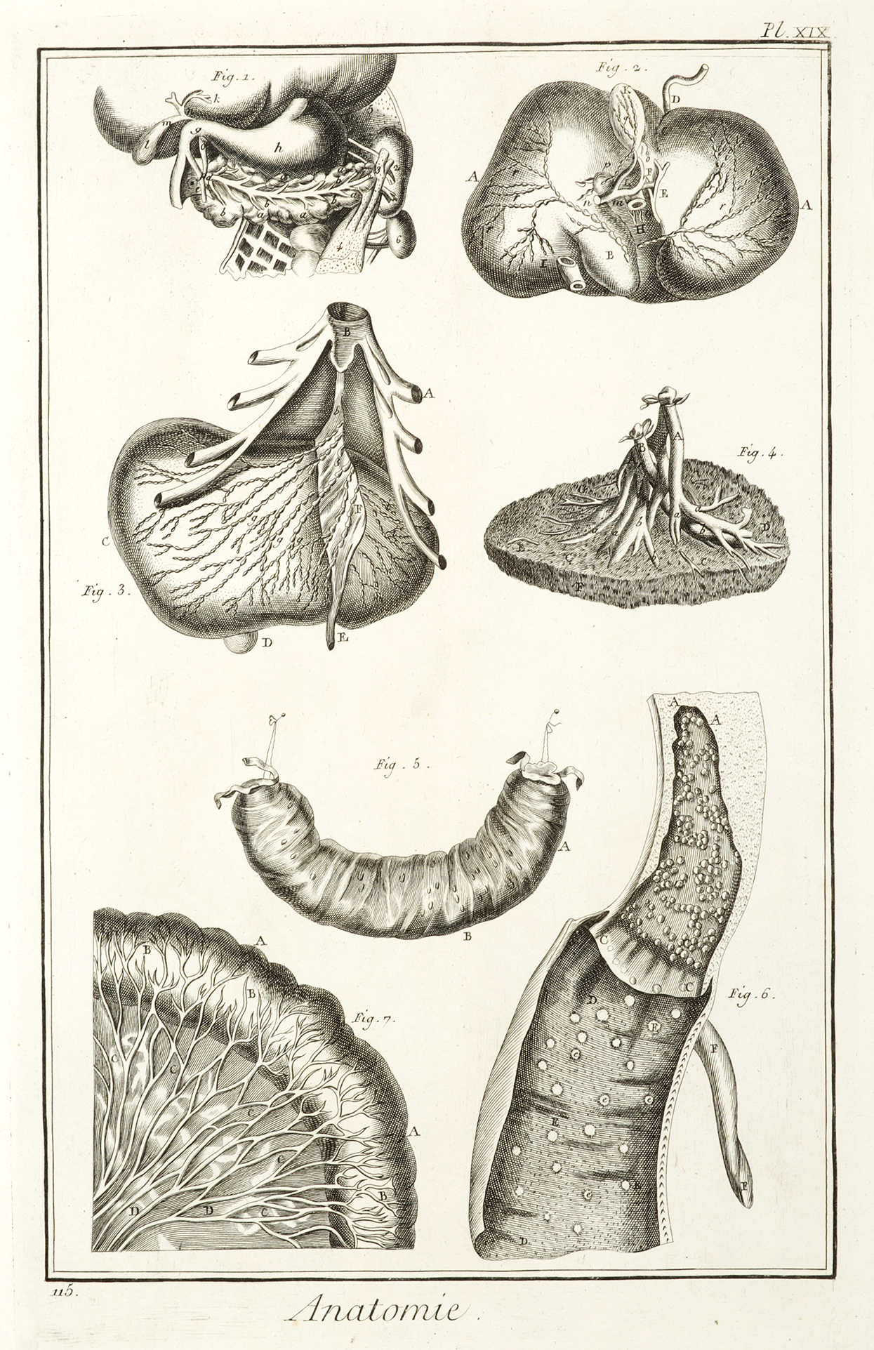Fine engraved anatomical engraving of the liver and stomach from Denis Diderots, Encyclopedi.