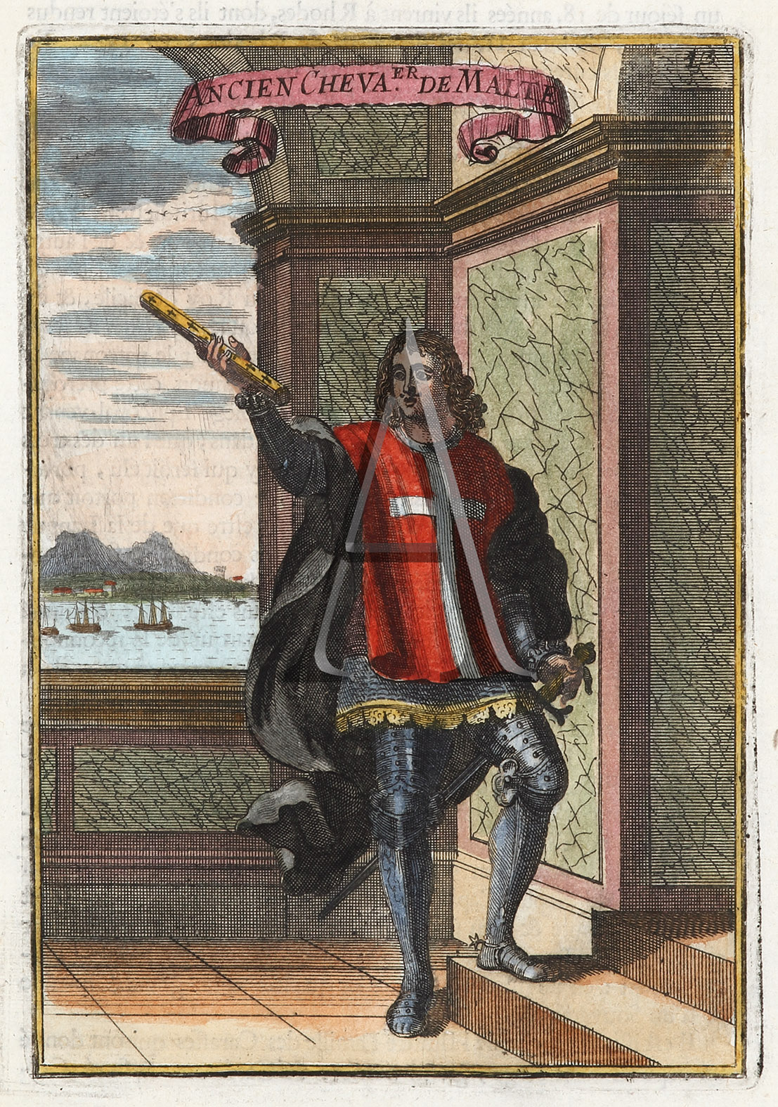 Early engraving of a Knight of Malta. From Mallet’s “Description DE L’Univers Conten. Du Monde..”