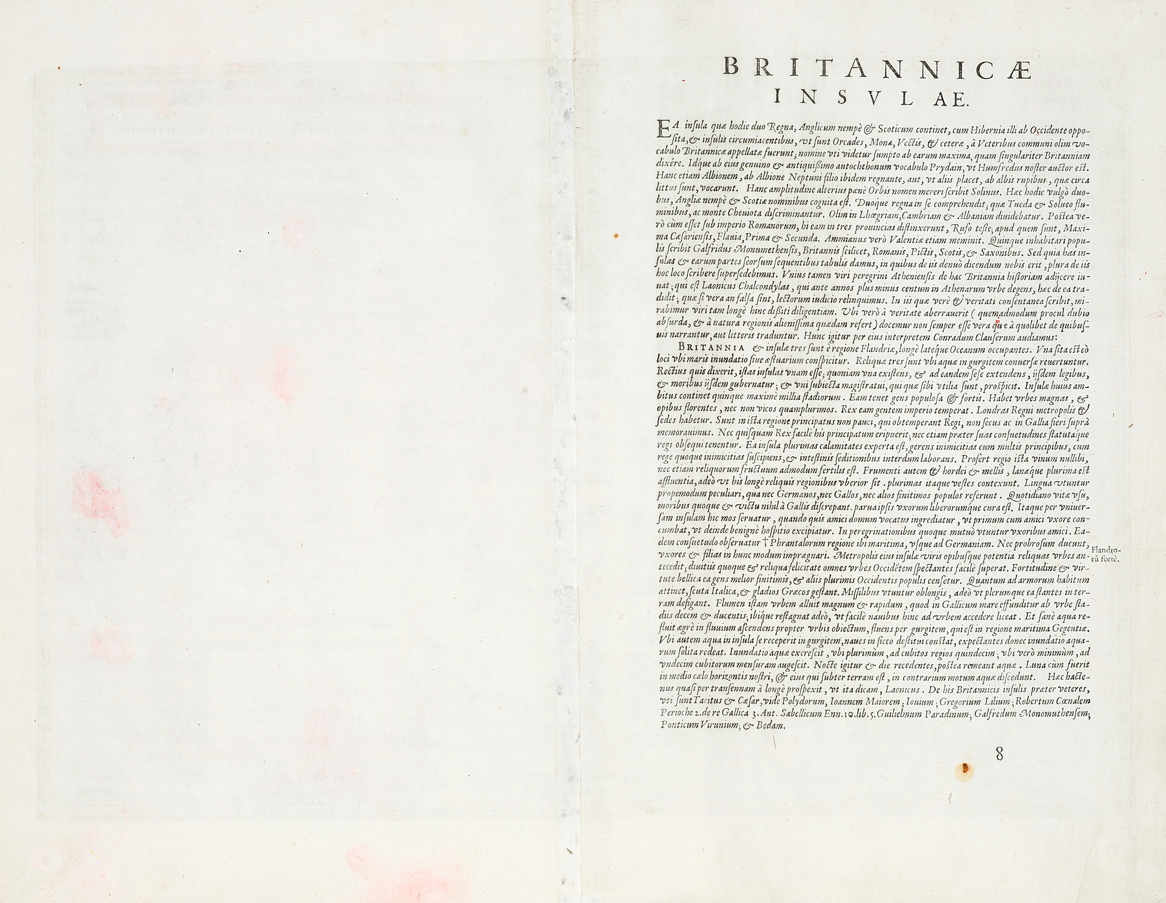 The text within the lower strap work panel, reads; Brittannia is mightiest in the area of the Western and Northern islands. The most powerful part at this time we call Anglia, after the Saxon people or the Angles, who invaded and ruled over the island under Valentinianus. The ancients distinguished it as Albion; the remaining parts of this area were collectively called Britannica. In the West it has Hibernia as its neighbour, which is nowadays called Ireland, and which is subject to the rulers of Anglia.