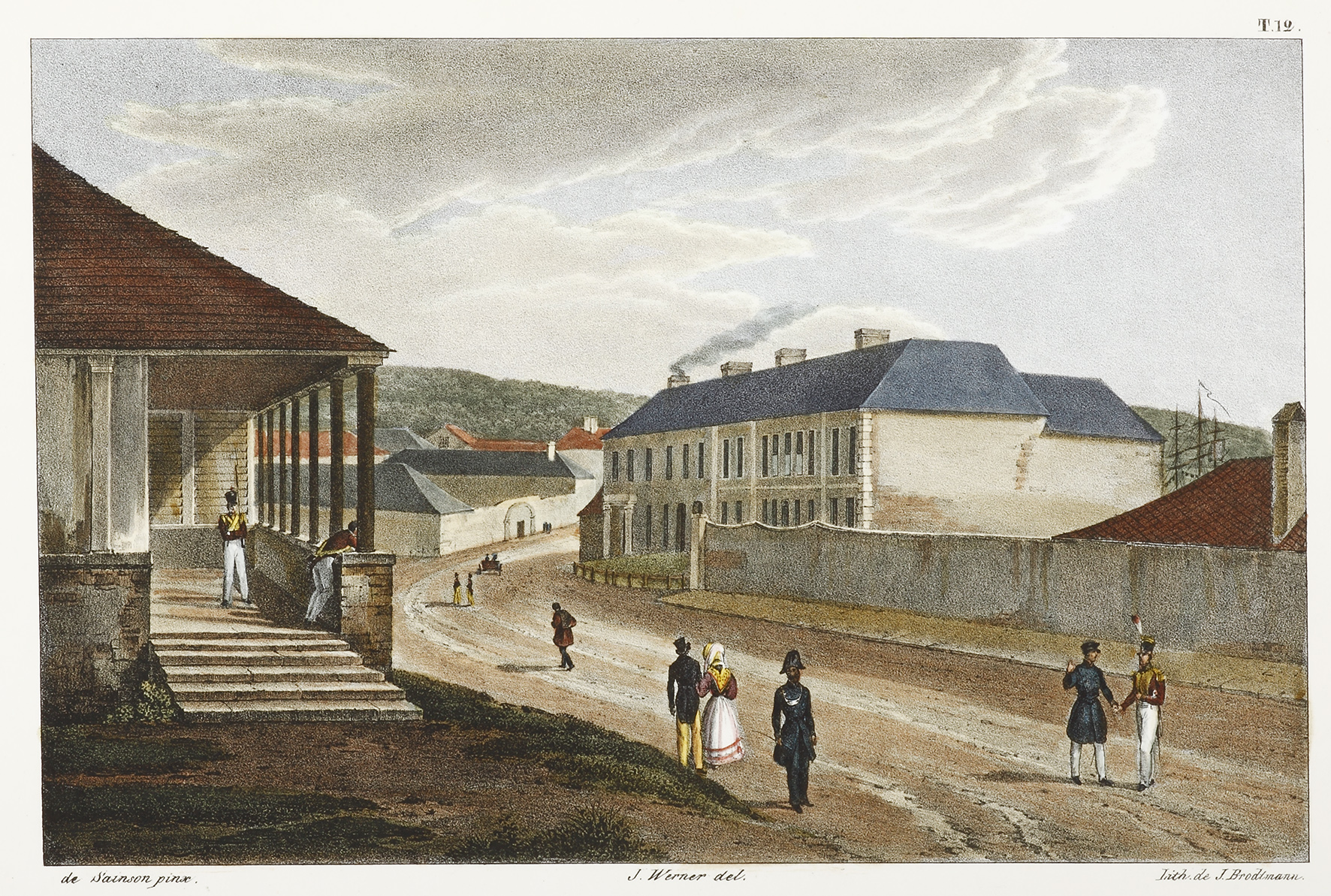 French artist on the voyage of exploration on board the Astrolabe under the command of Dumont D’Urville which explored and visited the Pacific, Asia, New Zealand and Australia. He began his naval career at the port of Rochefort, working there from 21 August 1825 until 6 January 1826, where he joined the Astrolabe as a draughtsman. The Astrolabe visited Australia from October to December 1826 and De Sainson made a number of drawings of King George Sound (WA), Westernport VIC), and Jervis Bay NSW and Sydney). On the Astrolable’s return to Australian waters during December 1827 to early January 1828 the Astrolabe anchored at Hobart Town where de Sainson made a number of important drawings of Hobart and its environs. On his return to France de Sainson was part of the editorial group that made the official account Historical Atlas of the expedition ready or publication. In November 1829, at Dumont d’Urville’s request, de Sainson was promoted commis de marine 3e classe. He became a Chevalier de la Légion d’Honneurin August 1831 and a commis de 2e classe in September 1833. Further biographical information is not available after this time.