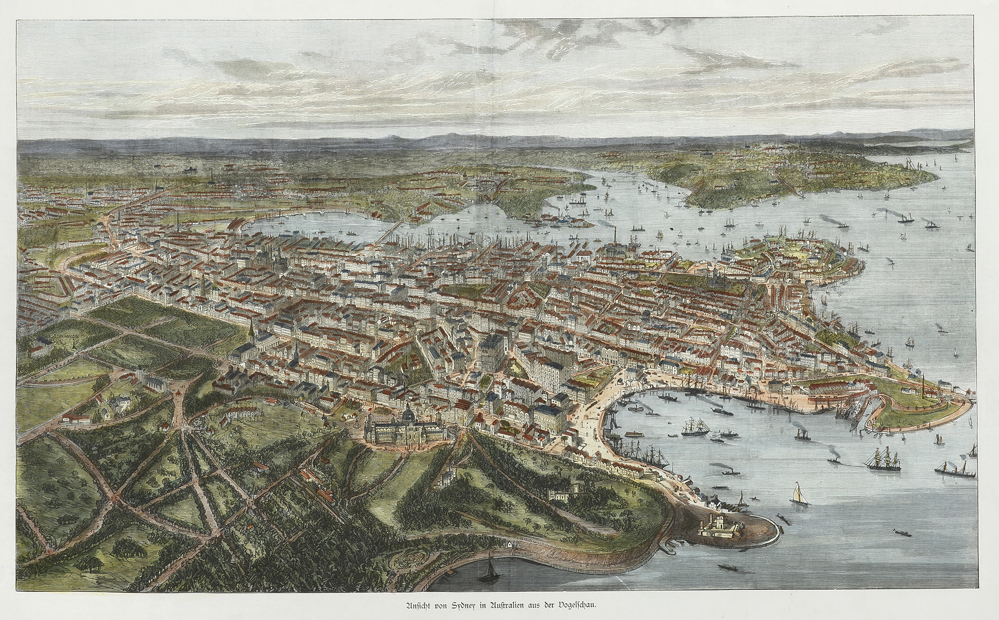 Superb birds-eye view of Sydney, taken from above Woolloomooloo looking west to the Blue Mountains. The Garden Palace, which burnt down on 22nd September 1882, can be seen at lower centre. The cricket ground was laid out in the north-western section of the park (just behind the current entrance to St James railway station) and all major games were played there until 1856. The cricket ground in Hyde Park with the stands are prominently shown.