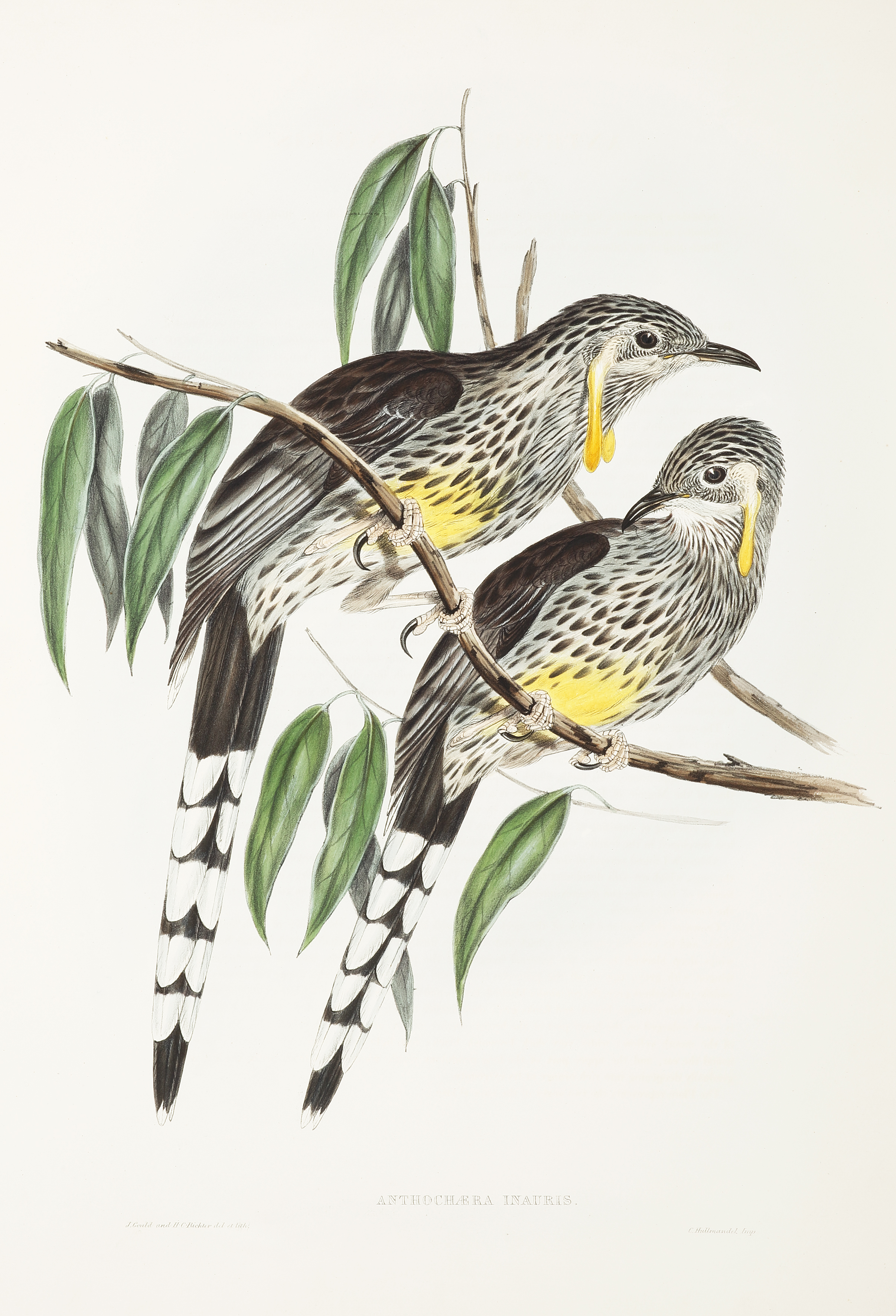 Rare lithograph of the best and largest colonial image of the Yellow Wattlebird by John Gould from his epic series, The Birds of Australia and Adjacent Islands, published for the author, printed by Richard and John E. Taylor, London.