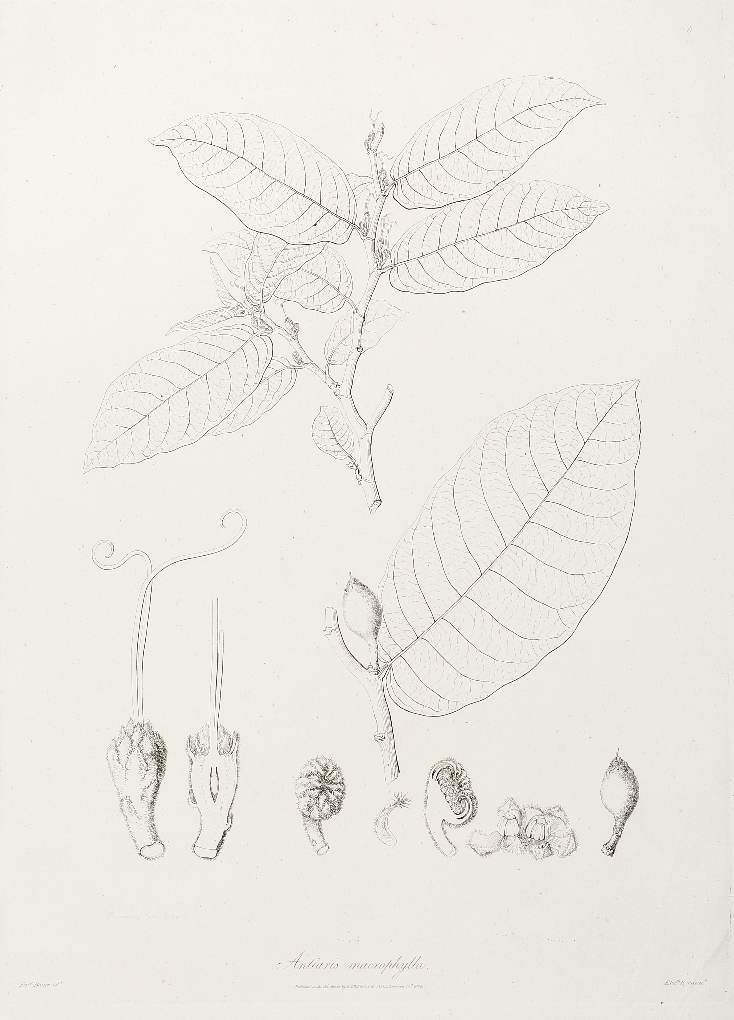 Exceptionally rare and historically important early c.19th botanical engraving of Antiaris by Ferdinand Lukas Bauer (1760-1826), collected and described by Robert Brown, artist and naturalist who had been personally selected by Joseph Banks to join Matthew Flinders monumental survey of the Australian coast.