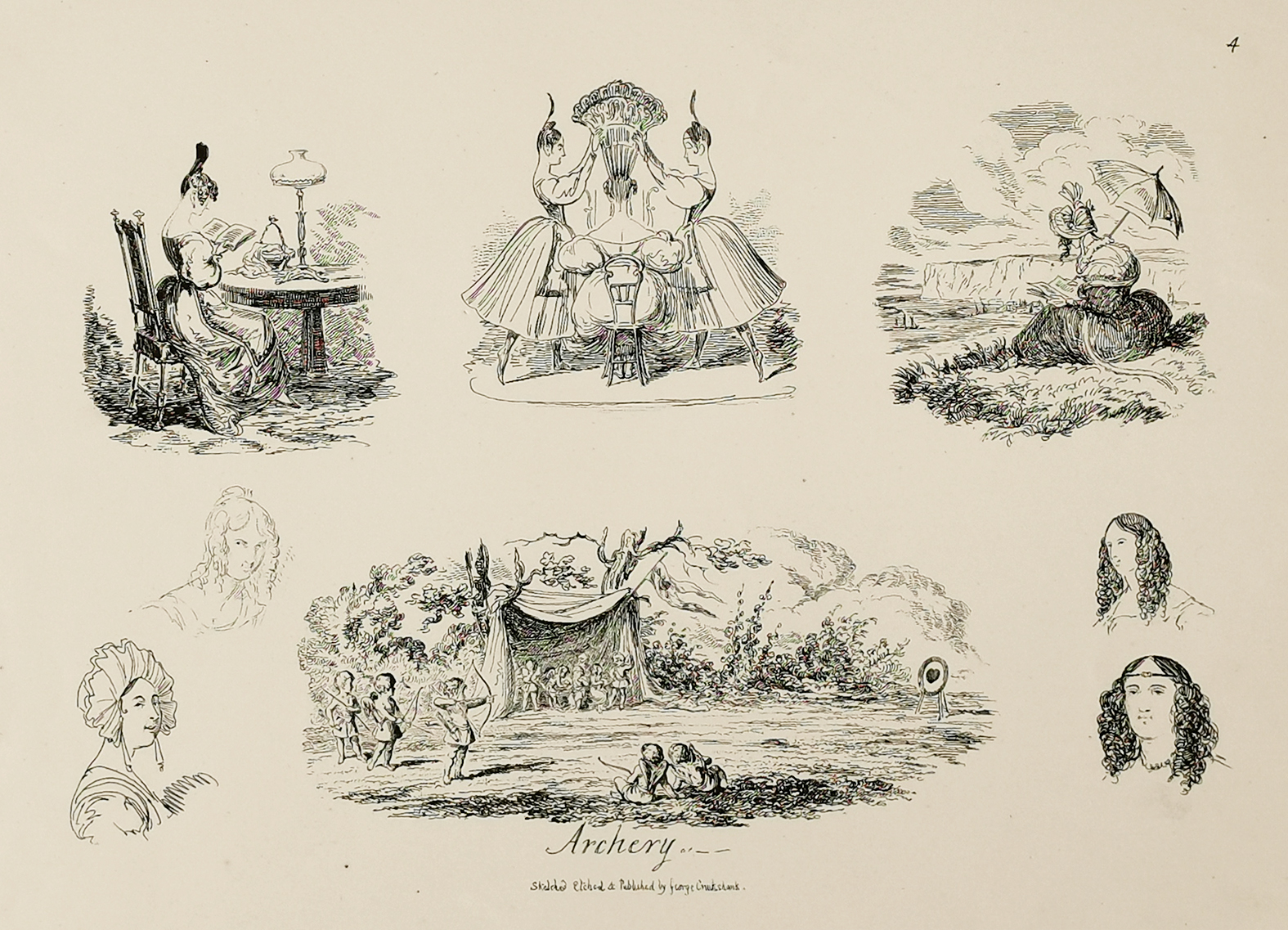 Cruikshank was one of the most prolific illustrators and satirical artists working in England and often referred to as the 'modern Hogarth'. Born in London, a member of the Cruikshank family of caricaturists and artists. His father Isaac was a well-known engraver and caricaturist who taught him etching, watercolor, and drawing. In 1811 while George was still in his teens, he gained popular success with his series of political caricatures that he created for the periodical,The Scourge, a Monthly Expositor of Imposture and Folly. This publication lasted until 1816, during which time Cruikshank came to rival James Gillray, the leading English caricaturist of the preceding era. In fact, because their style was so similar as to be indistinguishable, Cruikshank was employed by Hannah Humphrey, James Gillray's publisher and landlady, to finish plates Gillray was too ill to complete. In the 1820's, Cruikshank began his book illustration period of his career with his most famous being for Charles Dickens's Sketches by Boz (1836) and Oliver Twist (1838). In the 1830's he began campaigning against the abuses of alcohol, especially gin. In 1847 he renounced all alcohol and became an enthusiastic supporter of the Temperance Society in Great Britain. Cruikshank produced a long series of pictures and illustrations, pictorial pamphlets and tracts for the Society. Cruikshank's crusade against the evils of alcohol culminated in The Worship of Bacchus,published by subscription and based on the artist's vast oil painting of the same name, now in the Tate Gallery in London. George conceived the idea for the painting during an 1859 weekly meeting of the Committee of the National Temperance League. He planned a "monumental painting depicting all phases of drunkenness, from beggar to lord and cradle to grave."He began the huge painting in 1860 and completed it in 1862.