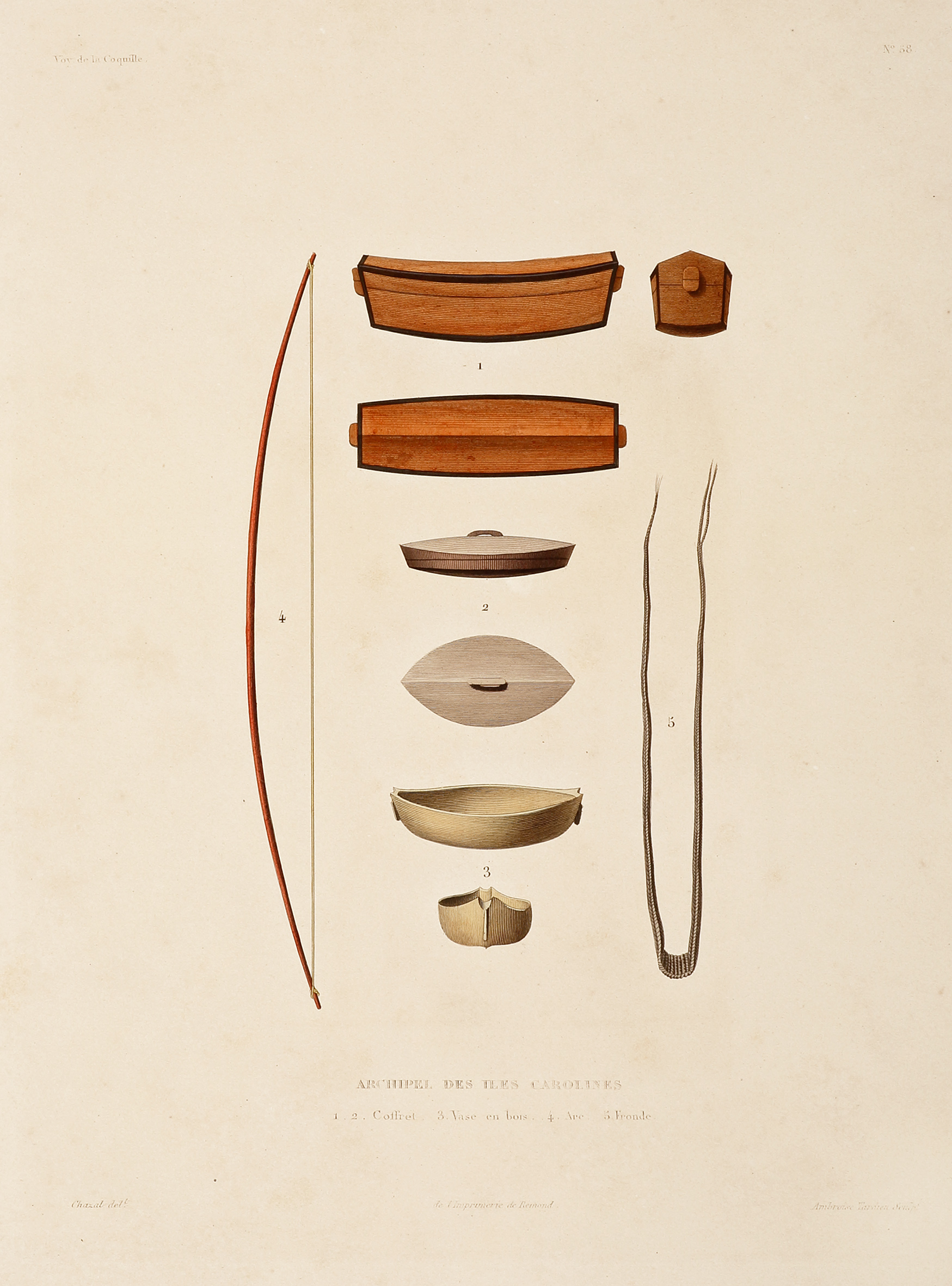 Rare engraving of native implements from the very rare account recording the voyage of the ship La Coquile, under the command of Louis Isidore Duperrey (1786-1865) and his deputy Jules Dumont D’Urville during the years 1822-1825.