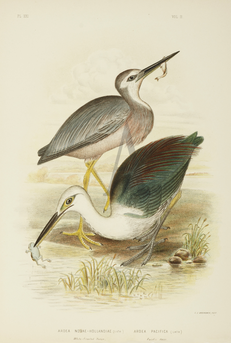 Broinowski was an artist and ornithologist, born in Poland and educated at Munich University where he studied classics, languages and art subjects. To avoid being conscripted into the Russian army, he went to Germany where a period of privation followed both on the Continent and in London, and about 1857 he joined a ship bound for Australia. Experiences at sea appear to have been very trying for him, so that he was glad to swim ashore at Portland, Victoria, and walk into the country. On that journey, according to his own record, he met with the only act of kindness he had received since leaving home: an elderly Scottish lady provided a meal and sent him on his way with 'new courage'. He worked in rural Victoria and later found employment with a firm of publishers in Melbourne; he then travelled widely in Victoria, New South Wales and Queensland, painting landscapes and scenes of various towns and promoting 'art unions' with his pictures as prizes. About 1863 at Richmond, Victoria, he married Jane Smith, daughter of the captain of a whaler. Settling in Sydney in 1880 he taught painting to private pupils and at colleges, lectured on art and exhibited at various showings of the Royal Art Society. He was then commissioned to supply the Department of Public Instruction in New South Wales with pictures of Australian birds and mammals. In 1887 Broinowski issued his famous series The Birds of Australia.