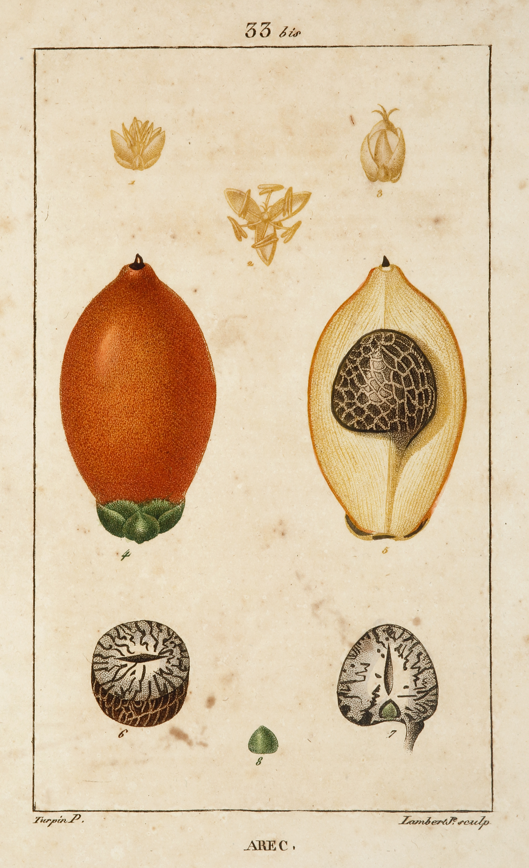 Very fine stipple engraving of the Areca nut tree from one of the most important French medicinal herbals of the 19th century. Rare. From Chaumeton, Flore Medicale References, Nissen BBI 349; Plesch 131; Pritzel 1679.