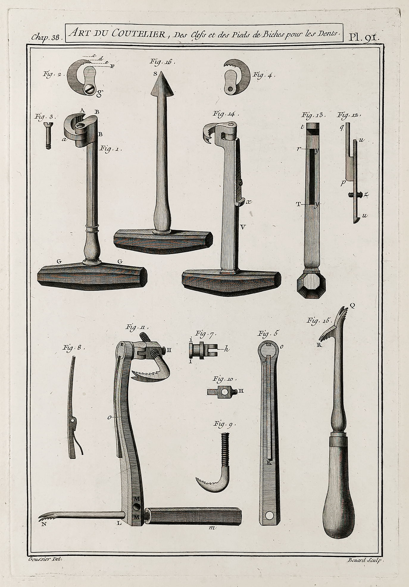 Superb c.18th engraving of keys and crow’s feet for the teeth. From volume three of Denis Diderot’s, Encyclopédie ou Dictionnaire raisonné des sciences, des arts et des métiers; The Art du Coutelier. (Art of the Cutler)