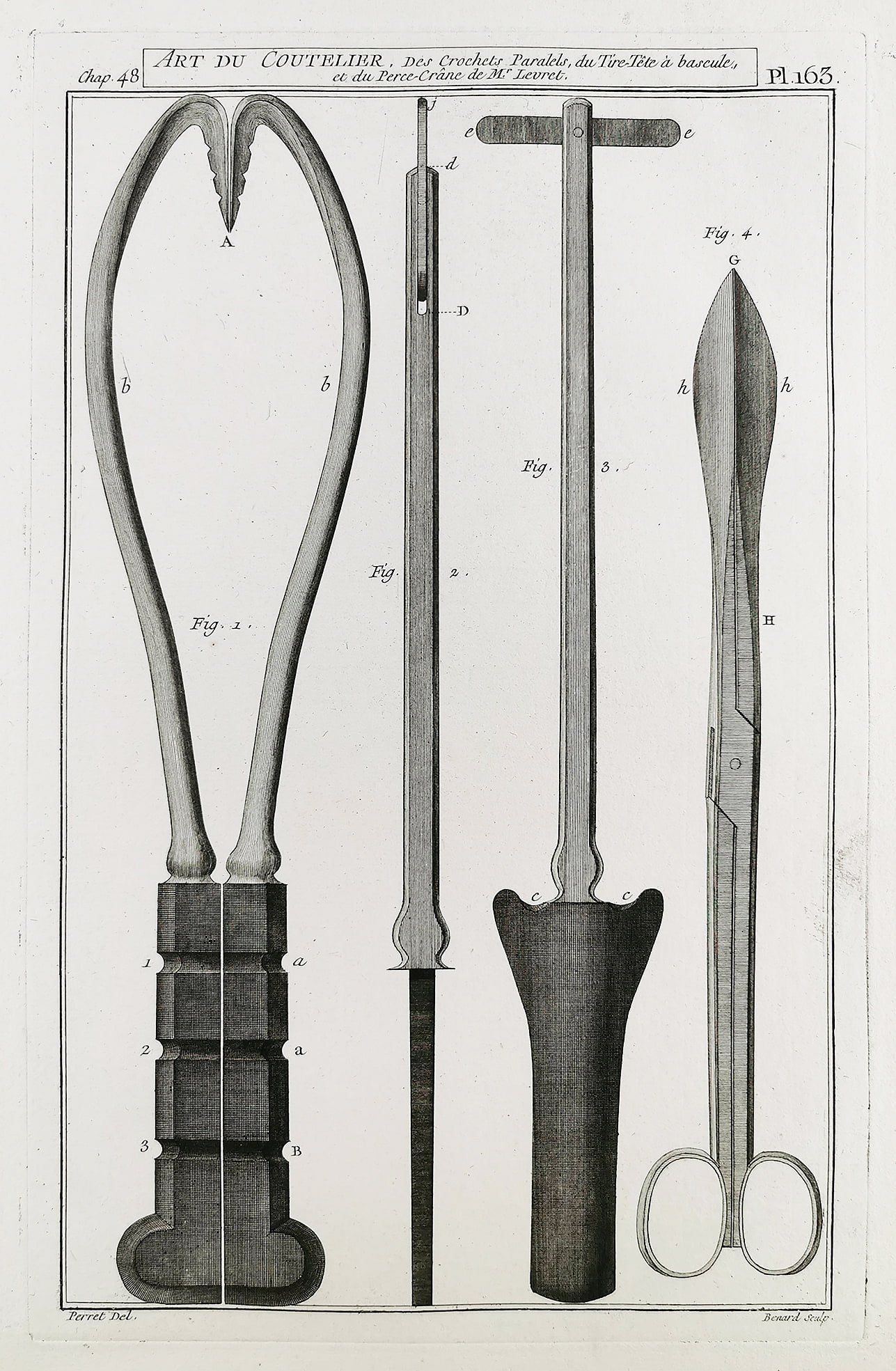 Superb c.18th engraving of surgical instruments by Mr. Levret. From volume three of Denis Diderot’s, Encyclopédie ou Dictionnaire raisonné des sciences, des arts et des métiers; The Art du Coutelier. (Art of the Cutler)
