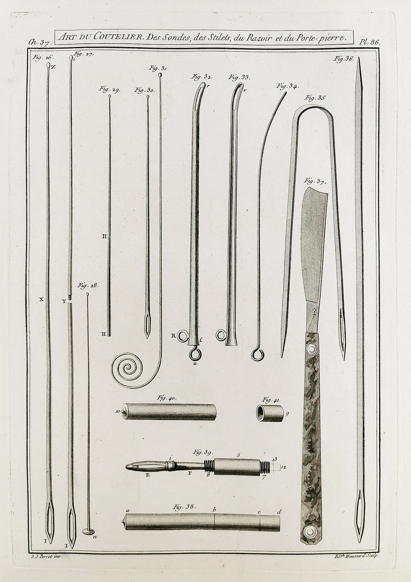 Superb c.18th engraving of probes, stilets, razor and stone holder. From volume three of Denis Diderot’s, Encyclopédie ou Dictionnaire raisonné des sciences, des arts et des métiers; The Art du Coutelier. (Art of the Cutler)