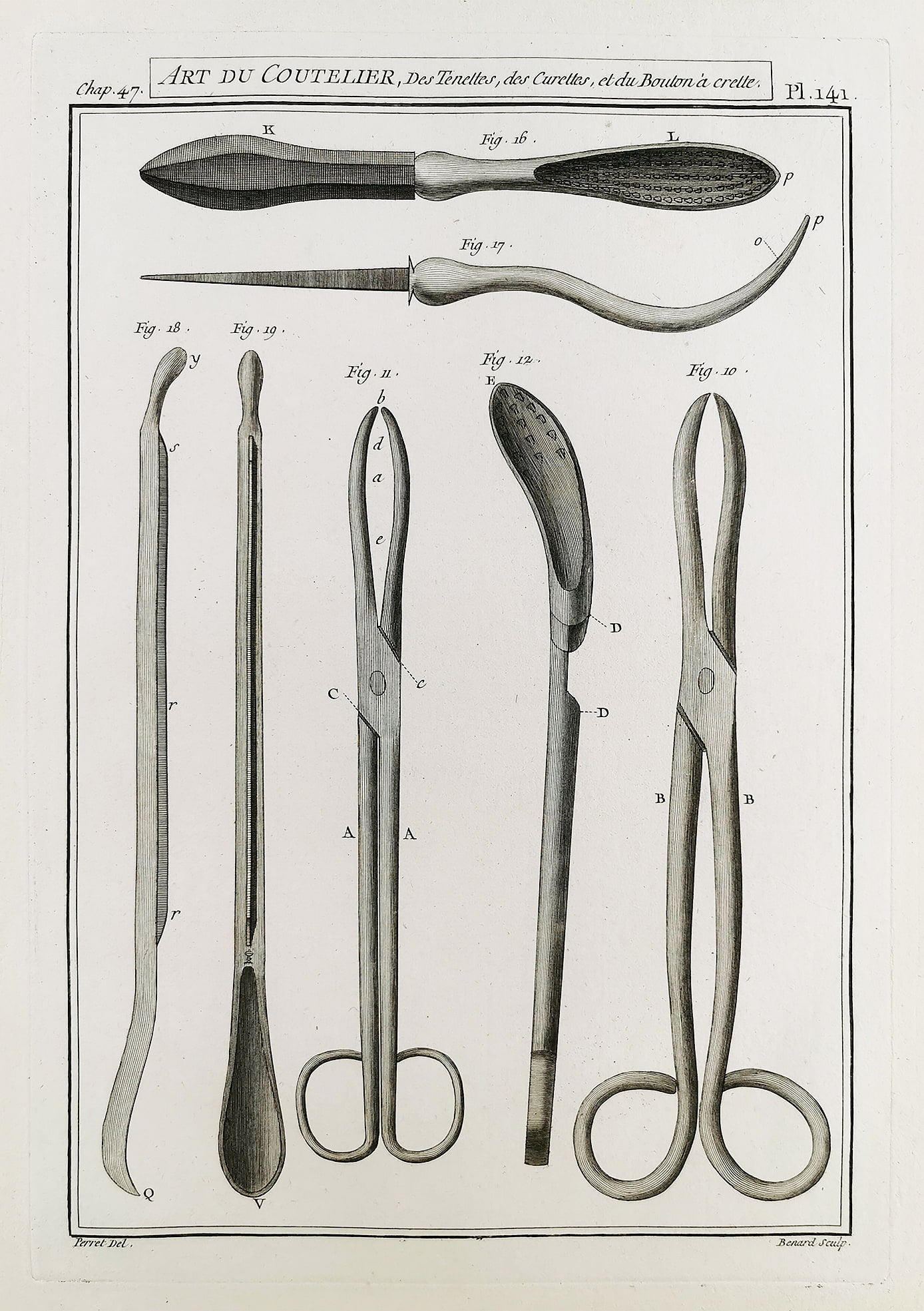 Superb c.18th engraving of Tentettes, Curettes, and Button a crette. From volume three of Denis Diderot’s, Encyclopédie ou Dictionnaire raisonné des sciences, des arts et des métiers; The Art du Coutelier. (Art of the Cutler)