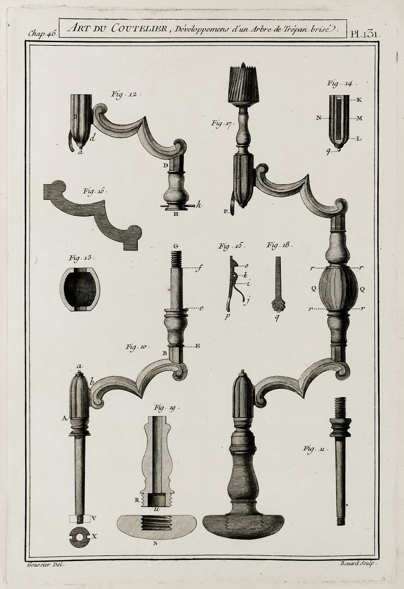 From volume three of Denis Diderot’s, Encyclopédie ou Dictionnaire raisonné des sciences, des arts et des métiers; The Art du Coutelier. (Art of the Cutler)