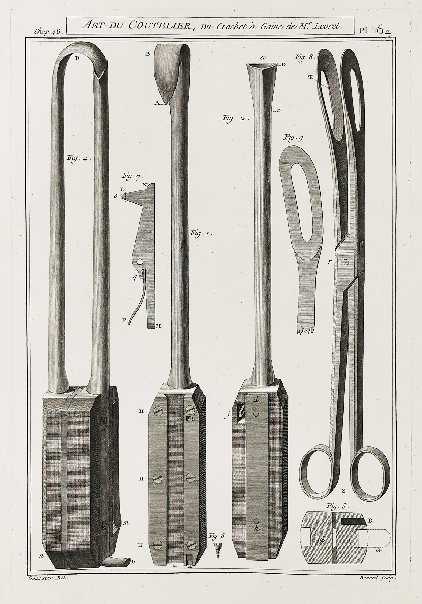 Superb c.18th engraving of du crochet a gaine by Mr Levret. From volume three of Denis Diderot’s, Encyclopédie ou Dictionnaire raisonné des sciences, des arts et des métiers; The Art du Coutelier. (Art of the Cutler)
