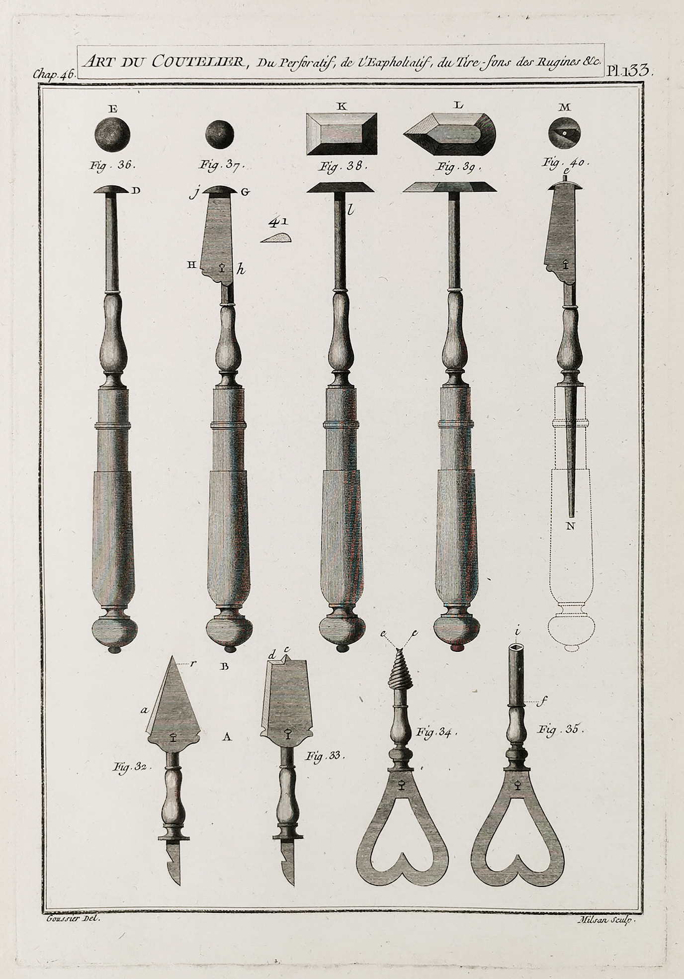 From volume three of Denis Diderot’s, Encyclopédie ou Dictionnaire raisonné des sciences, des arts et des métiers; The Art du Coutelier. (Art of the Cutler)