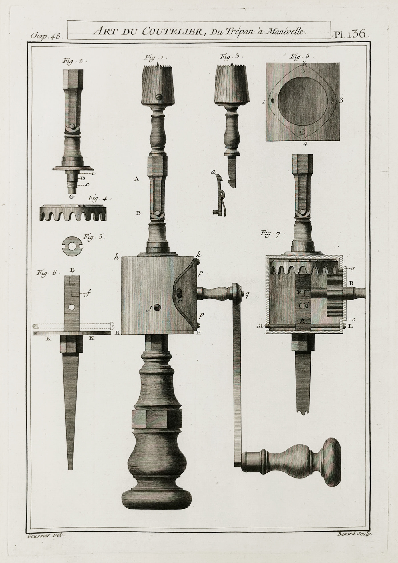Superb c.18th engraving of trepan to crank. From volume three of Denis Diderot’s, Encyclopédie ou Dictionnaire raisonné des sciences, des arts et des métiers; The Art du Coutelier. (Art of the Cutler)