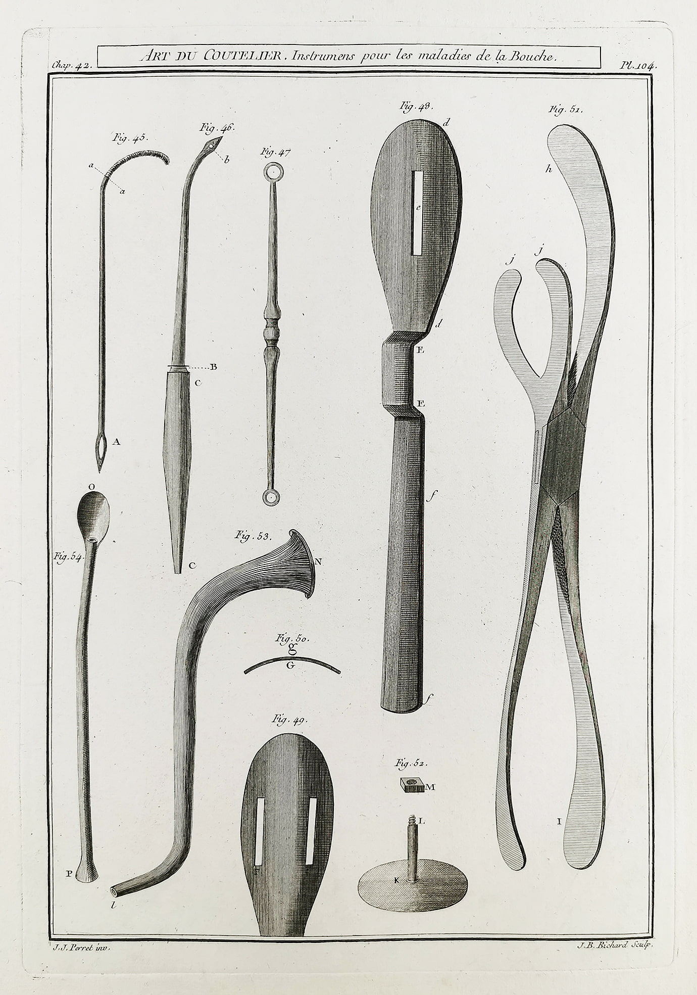 Superb c.18th engraving of instruments for the diseases of the mouth. From volume three of Denis Diderot’s, Encyclopédie ou Dictionnaire raisonné des sciences, des arts et des métiers; The Art du Coutelier. (Art of the Cutler)