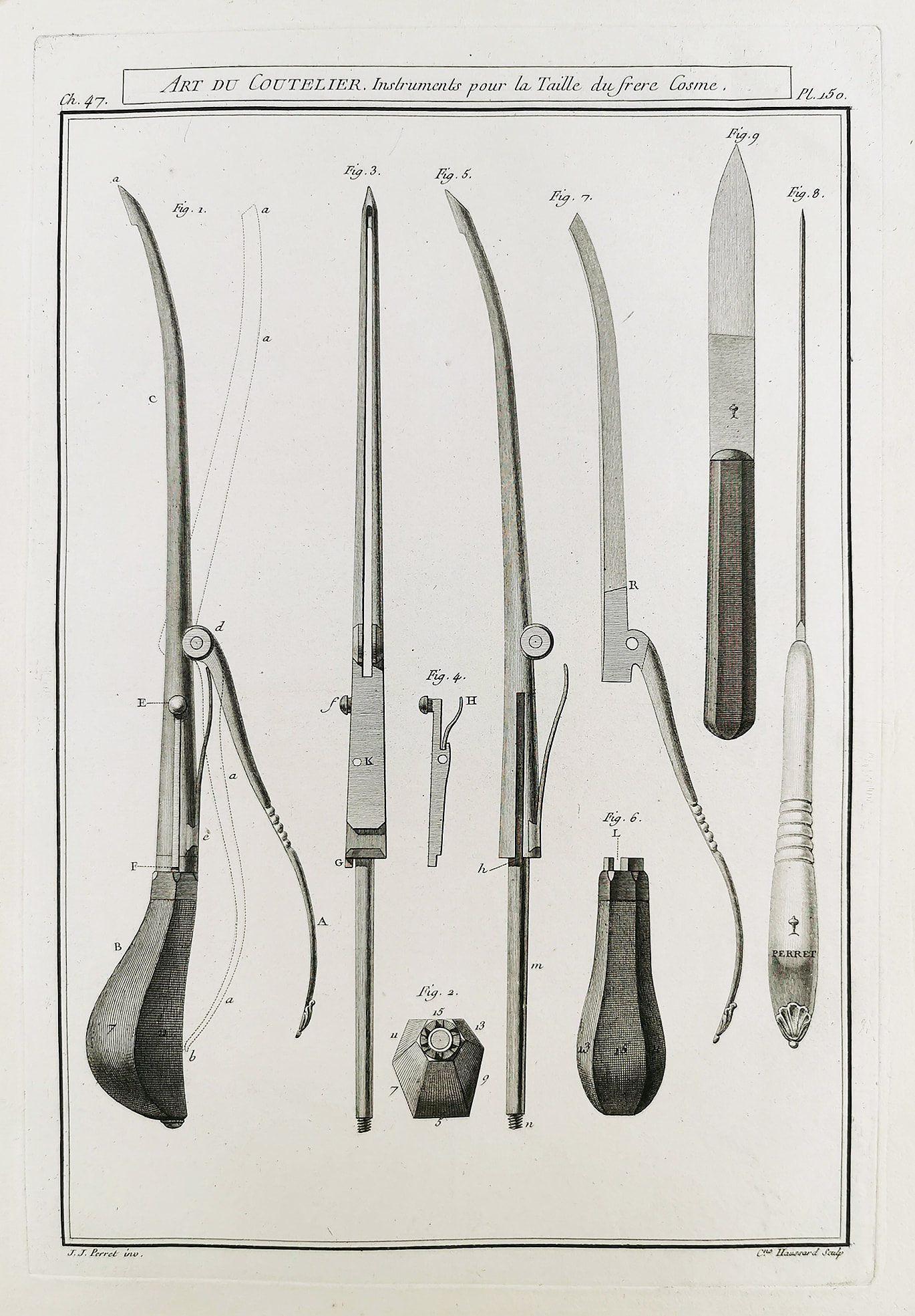 Perret was the son of a poor cutler and destined to follow in his father's business. At the age of 12 , at the end of his apprenticeship, he left for a tour of France, traveling through the main towns of the south, traveling on foot, with the ambition of going to Paris, after having made his hand in the provinces. When he arrived, aged 15 , he went to the most skilled and renowned master cutler in the capital. The foreman, of the workshop who were made up exclusively of experienced workers, refused to test him. He then went to beg to the boss himself who was a maker of surgical tools, a specialty not familiar to Perret, the foreman ordered him to make a lancet, an instrument whose design required the greatest care and the most extensive knowledge on handling steel. Since this task could not be entrusted to the untrained hand of an apprentice, the latter had to fail, and his dismissal from the workshop was assured. However, without uttering a word, he set to work and only left the workshop after having made the tool. The perfection of the instrument was so extraordinary, the turn of the lancet so new that the foreman, who was called Foucou, became his friend and his protector. The workshop workers also awarded him the instrument he had so advantageously perfected, as a reward. The manufacture of surgical instruments being the noblest part of the art of the cutler, he only thought of advancing knowledge and as it was essential for him to operate on a corpse himself, and to carry out almost all the surgeon's operations, in their presence, to achieve his goal, he attended the anatomy course of the School of Medicine. His attendance was noticed by a medical student Claude-Nicolas Le Cat, who was to become the famous surgeon. One day at the dissection workshop, Lecat was complaining about his scalpel, Perret came up to him to offer him one of his own making. Lecat, having admired the finish of the instrument, asked him who he was and what he was taking dissection lessons for. Perret having answered him that he was a cutler worker wishing to improve himself in the manufacture of surgical instruments, but that he was too poor to be able to devote himself to dissections, Le Cat replied: "You are poor. , you say, eh! well you will dissect with me." The plan of the cutler worker has long fuelled conversations at the School of Medicine in Paris. The Morand doctor, royal censor and inspector of military hospitals, have desired to know him, soon granted him protection. No major operation was undertaken without Perret being informed. Doctor Morand even allowed him to operate under his eyes. In 1753 he became a distinguished anatomist, aged 23, against all requests from Le Cat, who strongly urged him to be admitted to a surgeon, he asked to be received master at the provost of the cutlers of Paris. His reputation was such that he was received unanimously. He had even been dispensed, as a master's son, from the masterpiece, but he formally declared that he did not want to enjoy any dispensation and that he would perform a job to be submitted for the approval of the guard jurors. To do this, he presented his colleagues with a steel cup, which has been kept in the archives of the provost, as a model of its kind. He given the hallmark as a new master of the sign of a cup on May 24, 1753. His workshop, until the time of his death, was located in rue de la Tixéranderie and quickly became the busiest in the capital. The manufacture of surgical instruments was continuous; twenty workers could not meet all the demands. Perret nevertheless undertook to leave his name to posterity by reproducing the surgical instruments of the ancients. After eight years of work, he succeeded in recomposing the arsenal of surgical instruments from antiquity and modern times. In 1761 he gained the esteem and gratitude of the Royal Academy of Surgery by presenting for its approval the most complete collection that has existed of both ancient and modern surgical instruments. He was then designated to all operating physicians as the man who combined the superior qualities of the educated man with the skill of the maker. He carried out serious studies on all parts of the art of the cutler, improving the most common processes, descending to the most minute details when he believed his investigations would result in the relief of mankind. This is how he devoted the year to improvements to be introduced in the shape and manufacture of razors. To solve this problem, he was inspired by the carpenter's plane to adjust a wooden barrel to a razor blade. After many successful tests of the instrument, he turned to the editor at Mercure de France , Pierre-Antoine de La Place , who described it and advocated its advantages. Perret's razors have became fashionable in France and abroad. Patient in his research, Perret never engaged in the making of a surgical instrument, without seeking to know what were the improvements to which he was susceptible. If the author of the instrument was alive, he would get in touch with him, and share his discoveries with him. If the instrument had an old date, it delivered it to the public with modifications which always received the sanction of learned bodies. Perret was also interested in substances sprayed and prepared to polish and give shine to cutlery works, which cutlers call potées. After passing from emery to pewter pot to give the edge of lancets, which needed a more beautiful polish, a luster and shine more beautiful than emery, the English had made a red pot, which gives the steel a very beautiful black polish. Since its establishment, Perret has never ceased to make tests to find out the substances that went into so-called “England” red, which French cutlers used, but without knowing their composition. In 1769 he solved the problem, after infinite manipulations, by developing a composition which gave the steel a polish as lively and as beautiful as that of England, to which he gave the name of pot