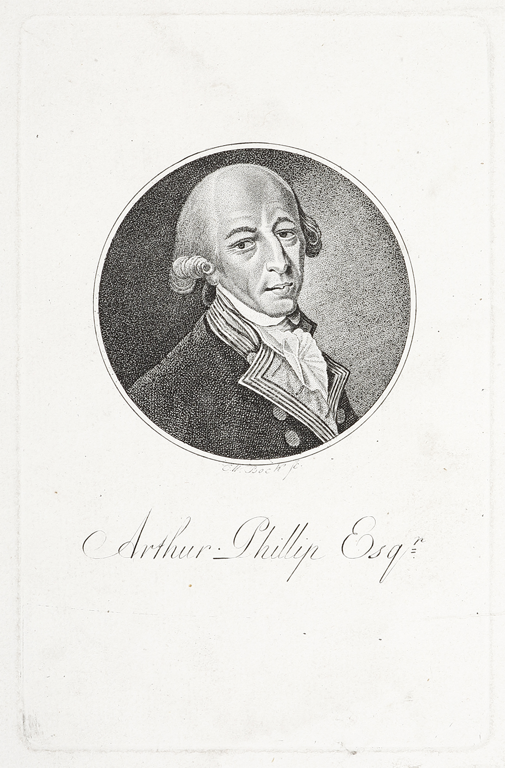 Scarce German c.18th First Fleet period engraving of the first Australian governor, based on the English version first issued in Governor Arthur Phillip’s accounts.