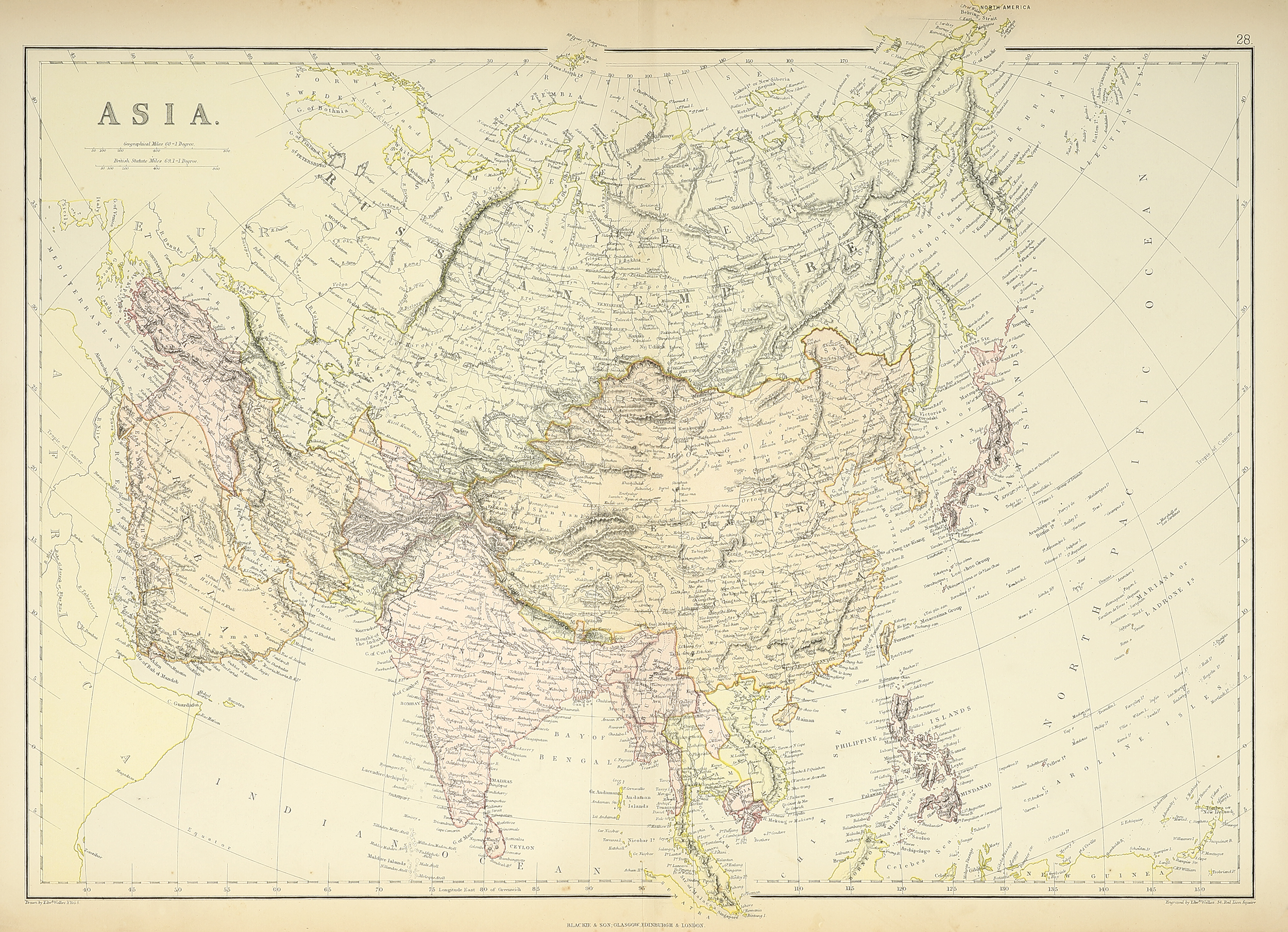 Detailed c.19th colour printed engraved map of Asia by Edward Weller (1818-1894). From W.G. Blackie’s, The Comprehensive Atlas & Geography of the World… Collections:National Library Australia: Bib ID: 1818869State Library New South Wales: Call Numbers:TF03289David Rumsey Collection: List No: 1589.004