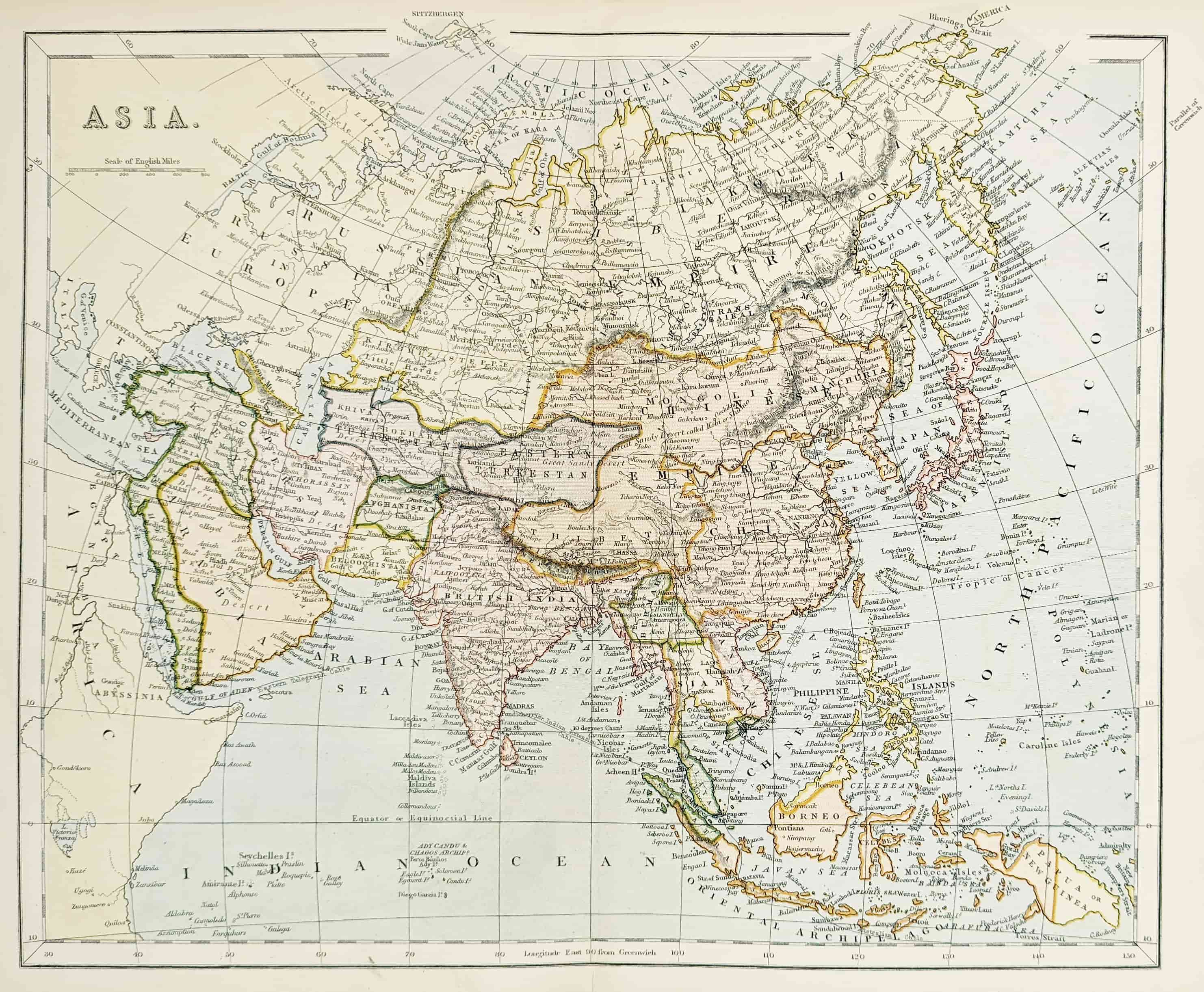 Detailed c.19th map of Asia with countries coloured.