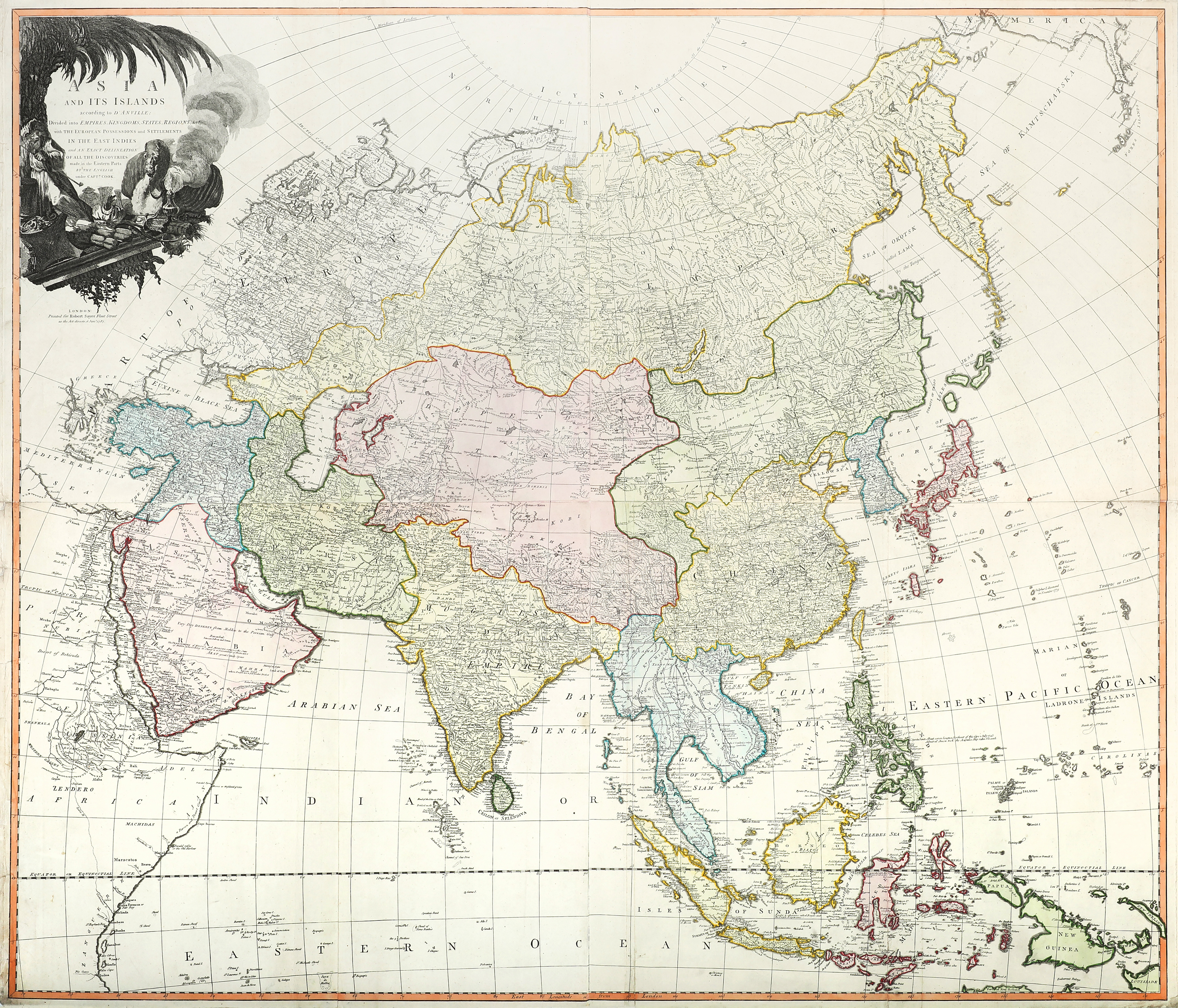 The map first appeared in 1772 titled; Asia According to the Sieur D’Anville, Divided into its Empires, Kingdoms & States, Showing the European Settlements in the East Indies. The title was then changed on 6th January 1787, as in our map to; Asia and its Islands, According to D’Anville; Divided into Empires, Kingdomes, States, Regions &c.with the European Possessions and Settlements In The East Indies and An Exact Delineation of all the Discoveries made in the Eastern Parts By The English under Captns. Cook. This is the first issue of this version of the title which was then reissued later a number of times.