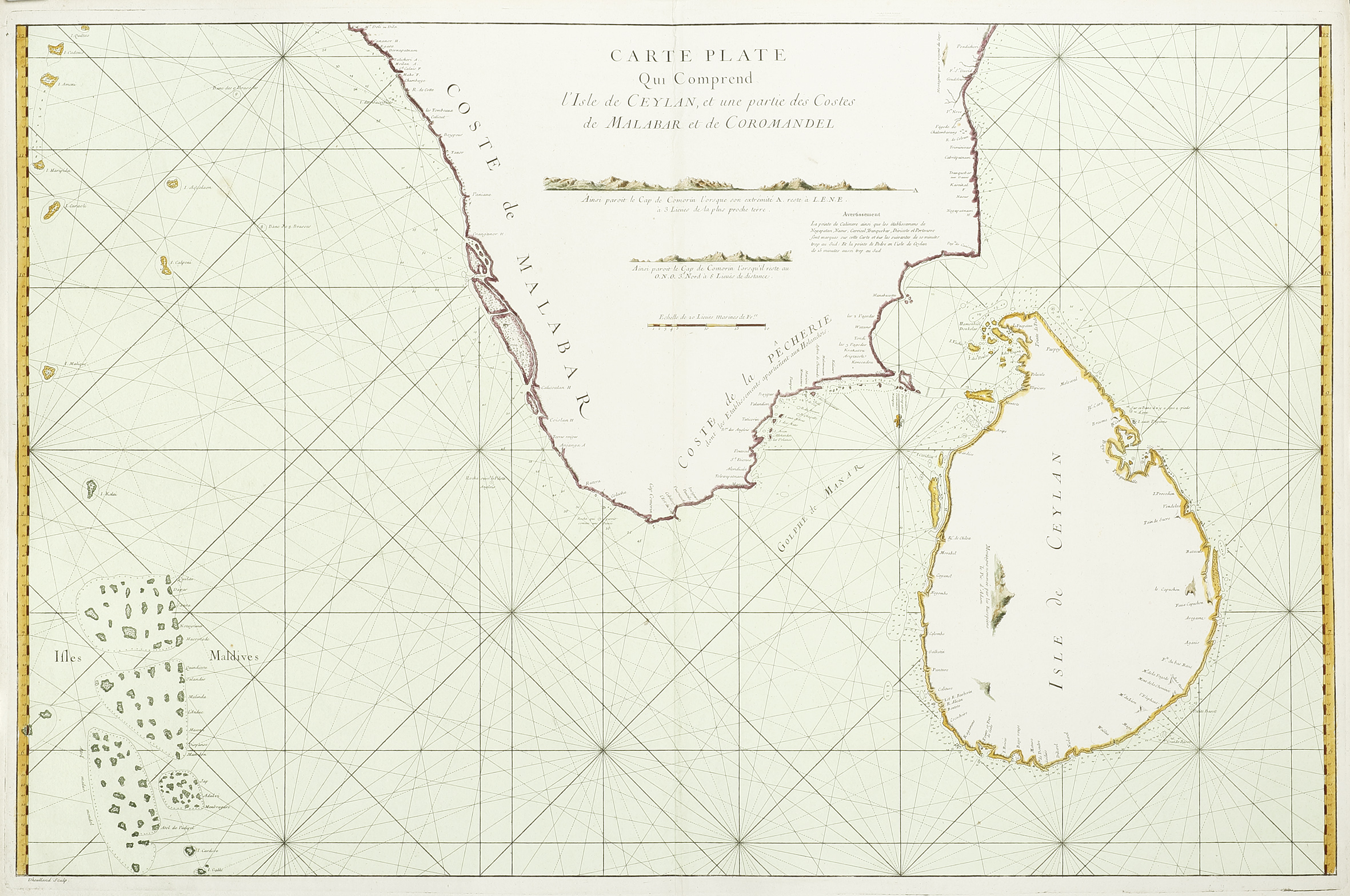Large scale c.18th sea chart of southern India and Ceylon, published in Mannevillette’s, Le Neptune oriental (Oriental Pilot), the most highly regarded pilot for the Eastern trade for both French and English ships. There are two small coastal profiles at centre of Cape Comorin.