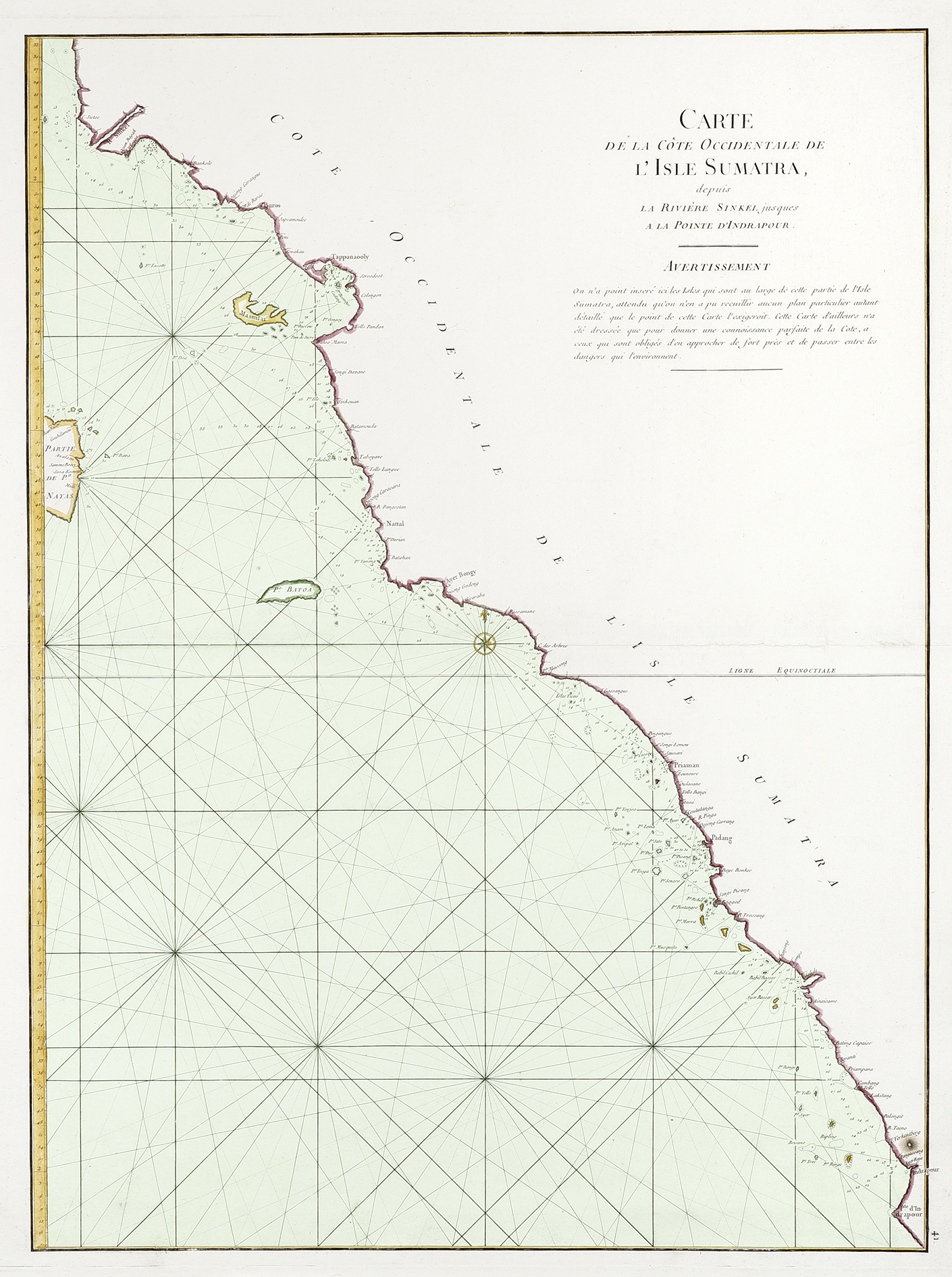 Scarce c.18th chart of the west coast of Sumatra from Touroumaine River to Indrapour Point, published in Mannevillette’s, Le Neptune oriental (Oriental Pilot), the most highly regarded pilot for the Eastern trade for both French and English ships.