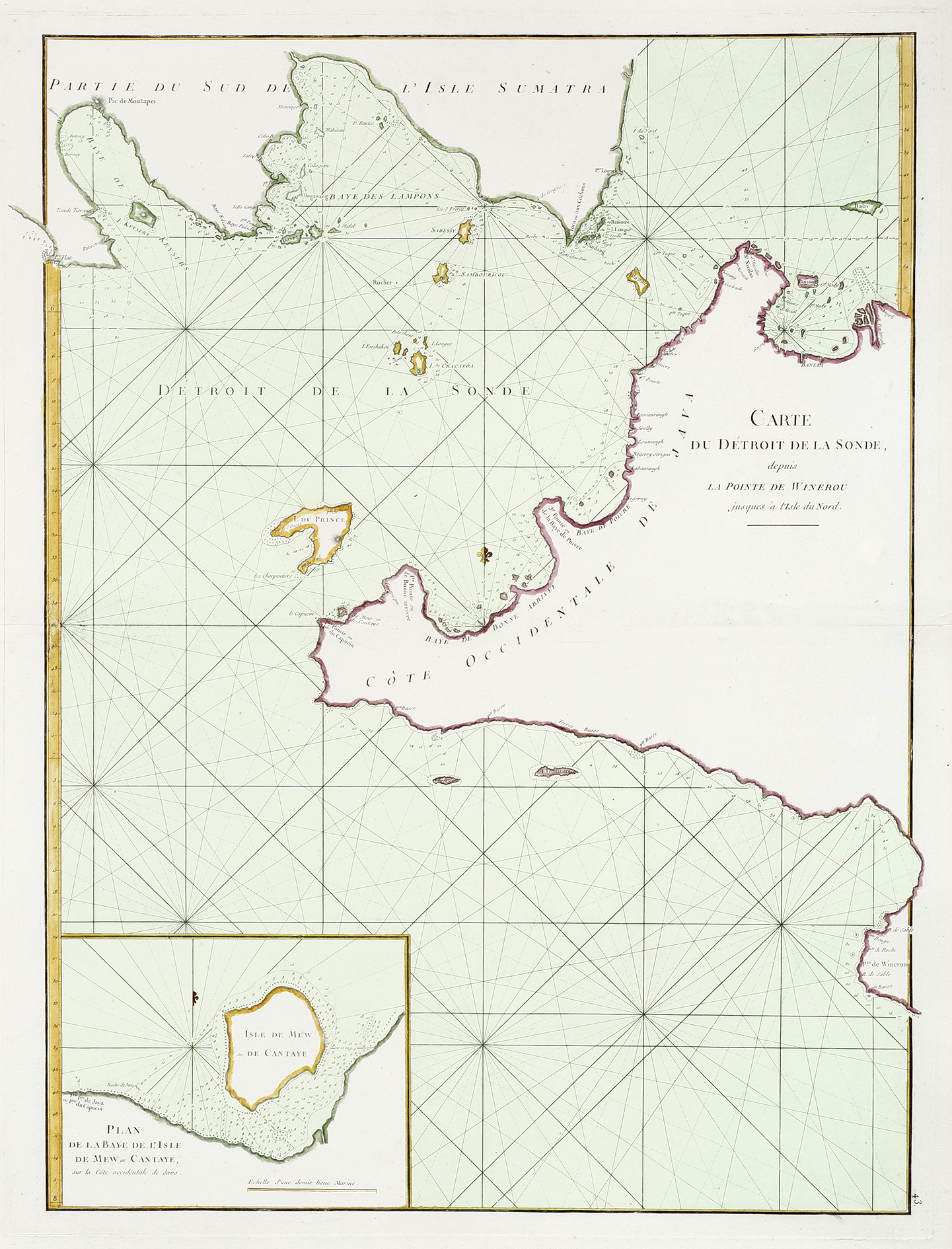 Large scale c.18th chart the Sunda Strait between Sumatra and Java, published in Mannevillette’s, Le Neptune oriental (Oriental Pilot), the most highly regarded pilot for the Eastern trade for both French and English ships.