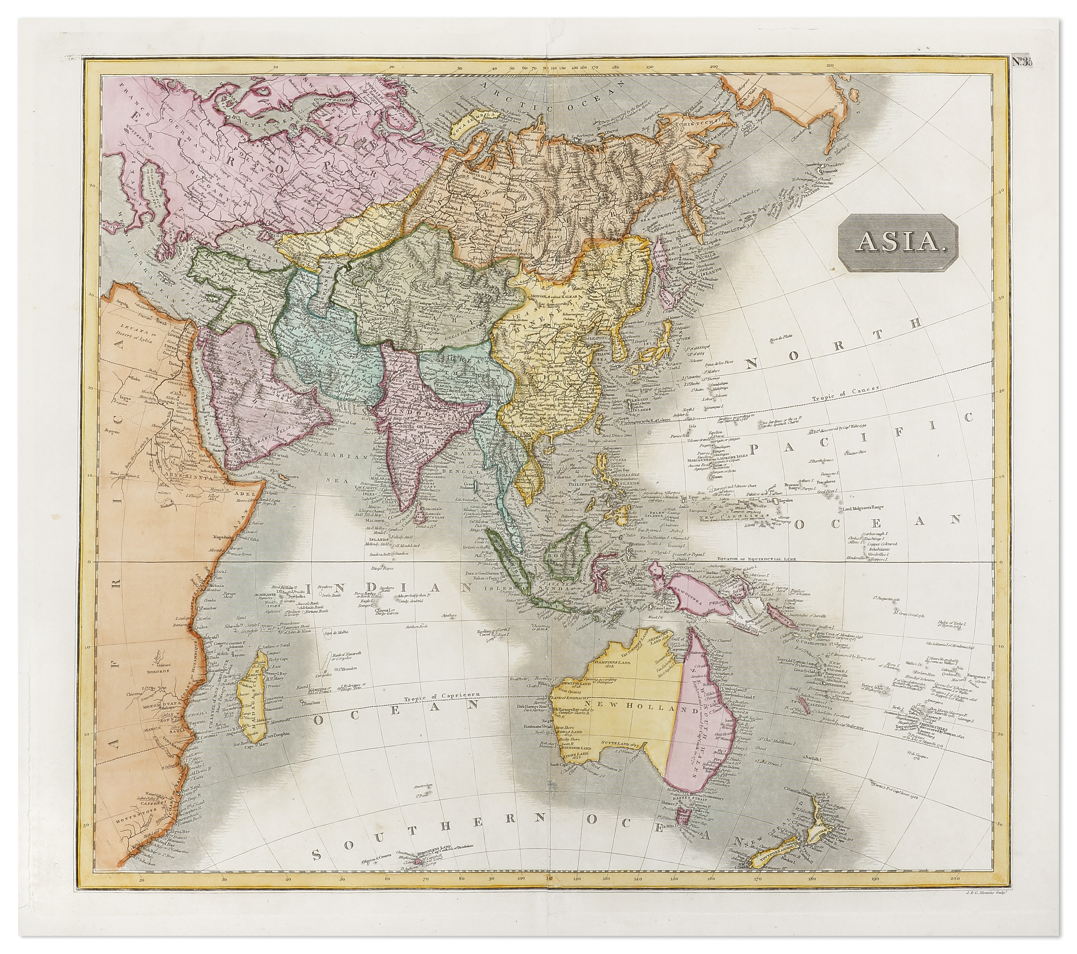 Large scale map of Asia and the Western Pacific with detailed historical information. ds. Each island is accompanied by the date of it’s discovery and the name of it’s discoverer. Australia is shown with Bass Strait but with an unexplored … Read Full Description