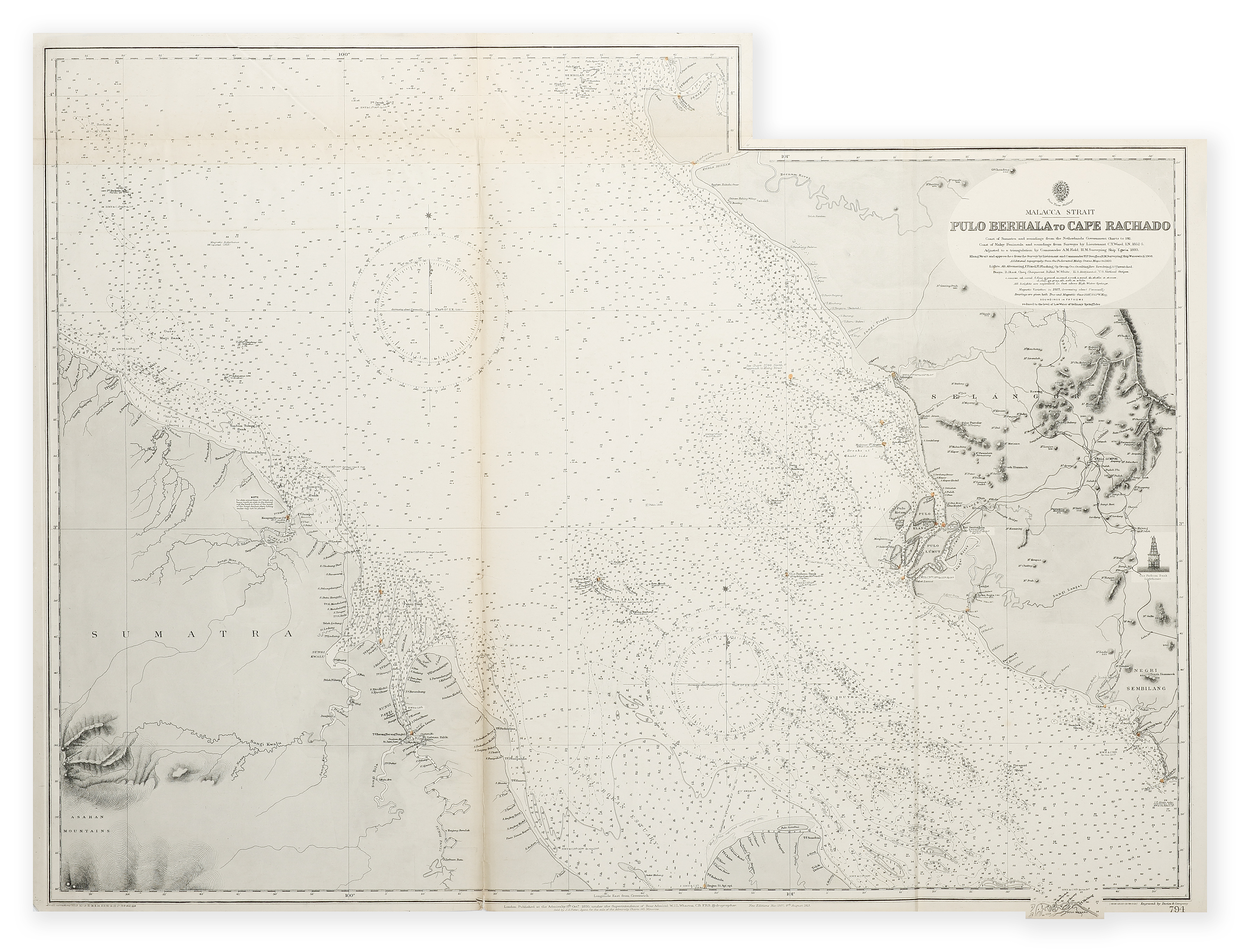 Scarce Admiralty hydrographic map of Malaysia’s coast line centred on Kuala Lumpur and extending from the Perak River in the north to Cape Rachado in the south.