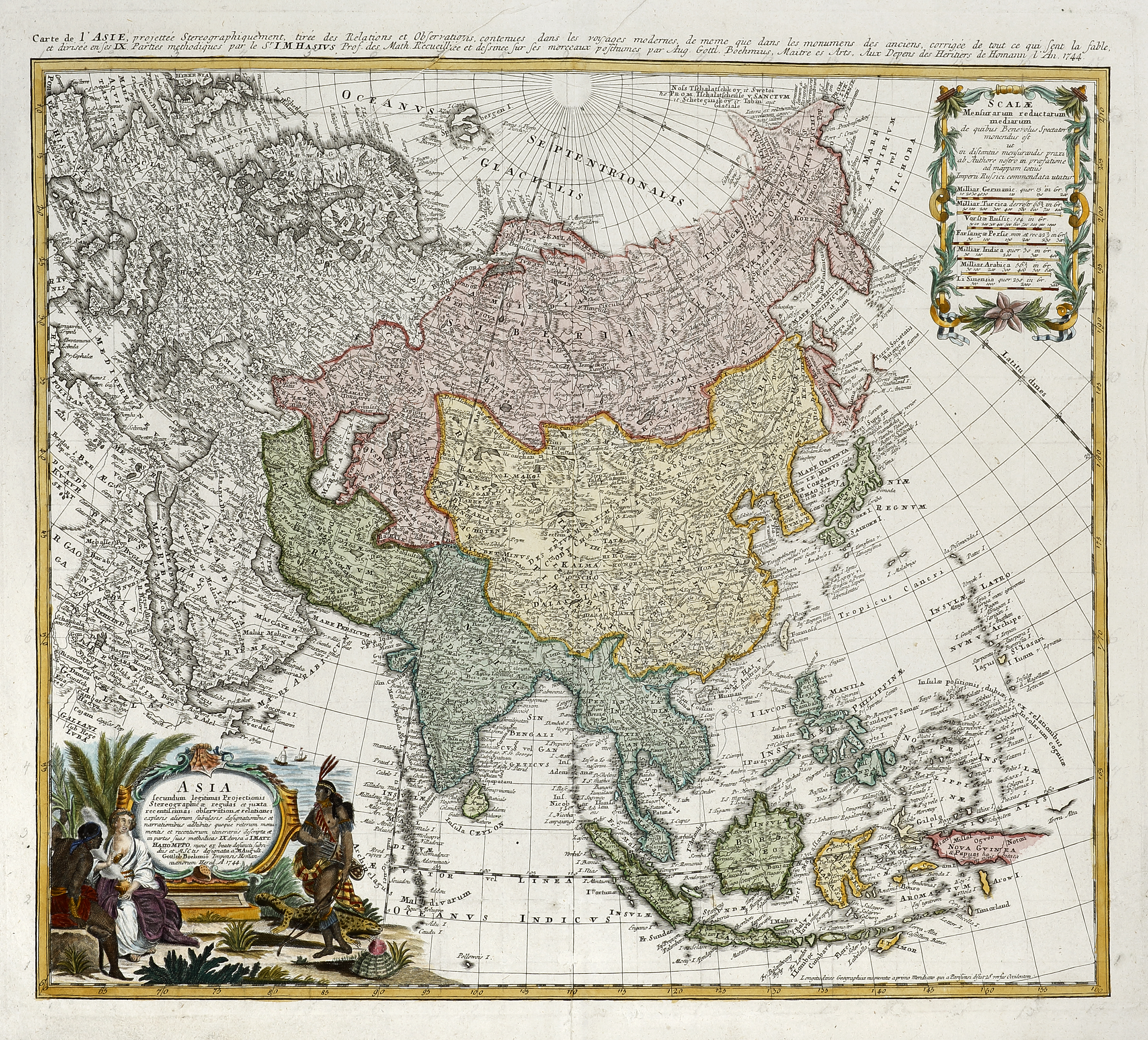 Large c.18th map of Asia the German map publishers with large cartouche. Detailed information based on the surveys made by the Jesuit missionaries is shown in China. Siberia is based on the Russian surveys made in the 1730’s and Japan is still shown with Hokkaido (Terra Eso Yedso Oku Yeso) connected to the mainland.