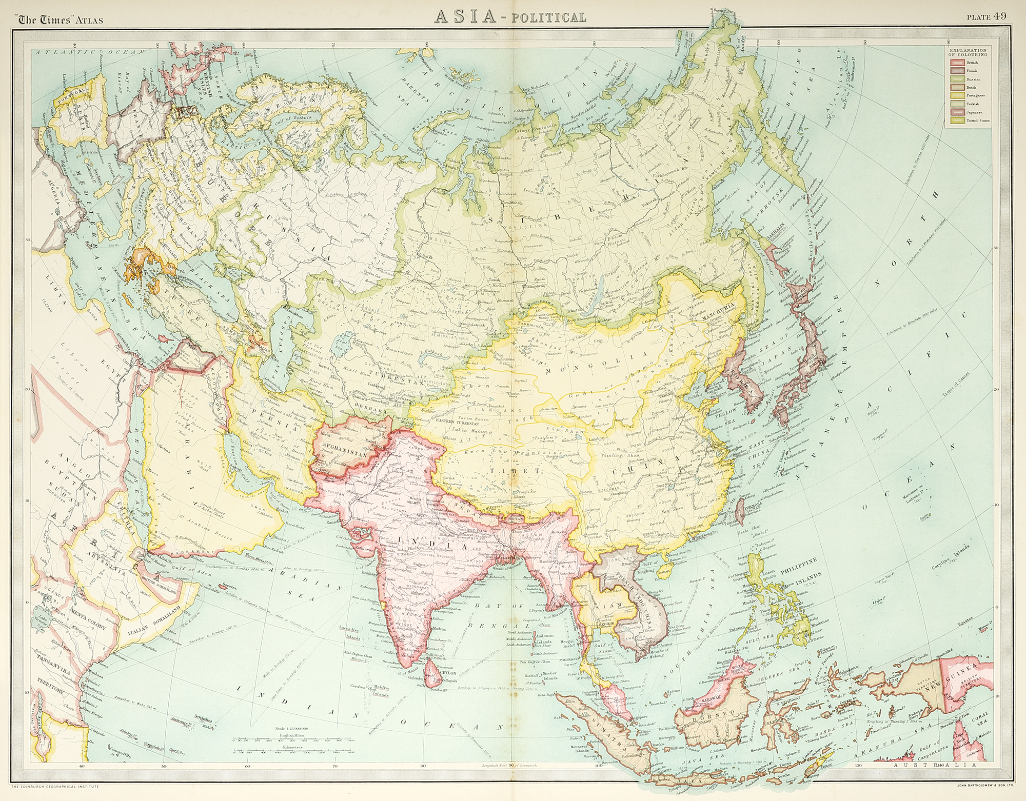 Very detailed large early C20th map of Asia with colour key showing colonial possessions.