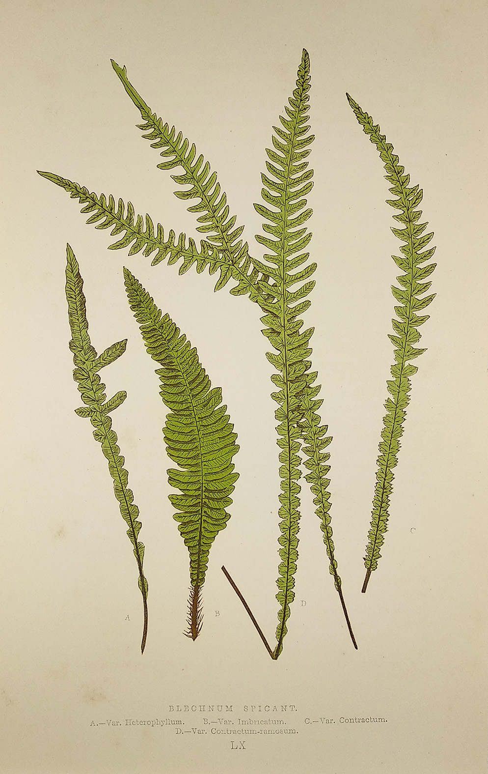 Blechnum Spicant. A.-Var. HeterophyNum. B.-Var. Imbricatum C.-Var. Contractum. D.-Var. Contractum-ramosum. [Deer Fern] - Antique Print from 1868