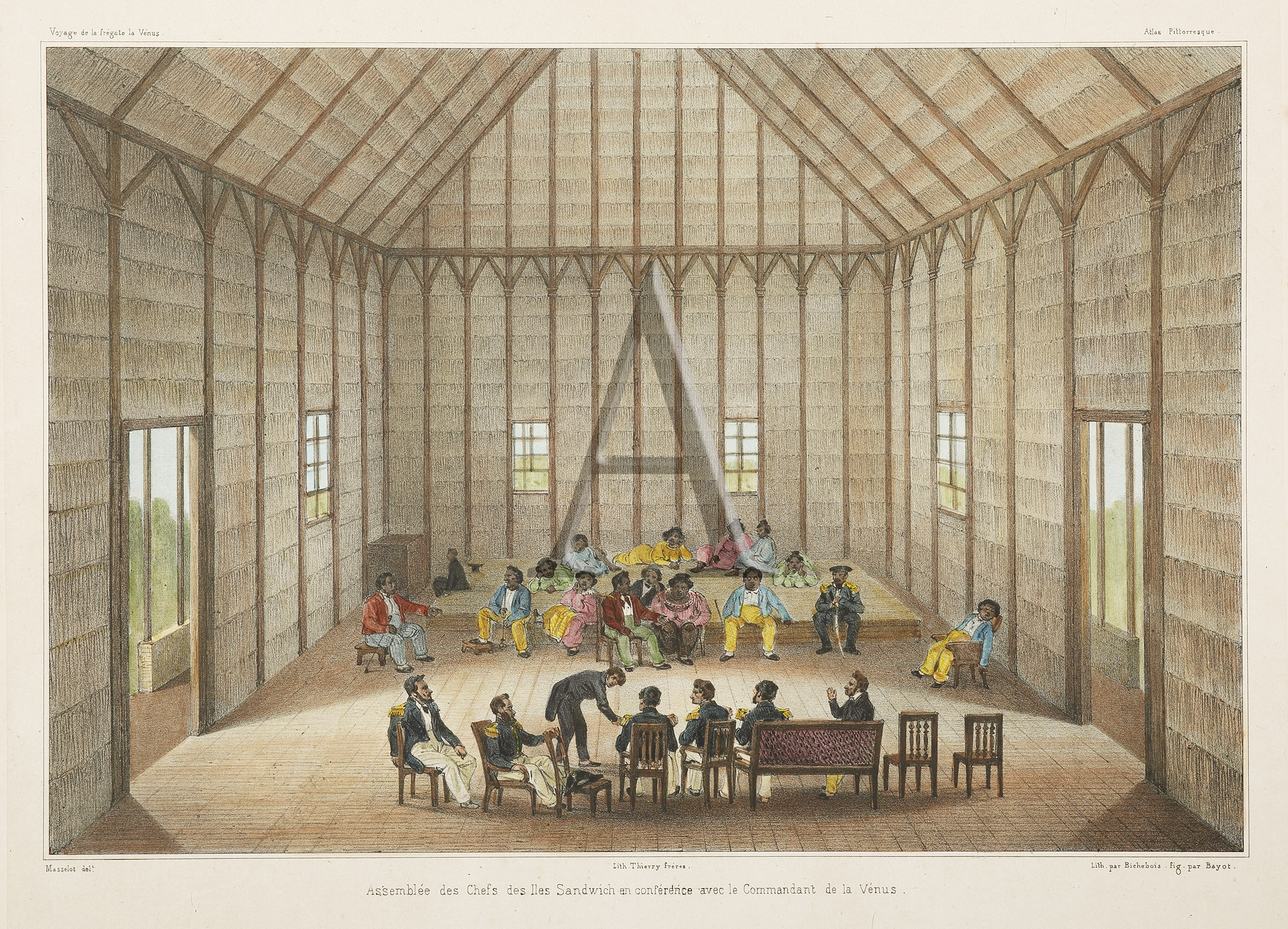 View of the meeting of Hawaiian chiefs with Dupetit-Thouars and his officers. The Venus had anchored off Honolulu on 8 July 1837, having sailed from Calao to check on the existence of the island of St Paul, shown on some … Read Full Description
